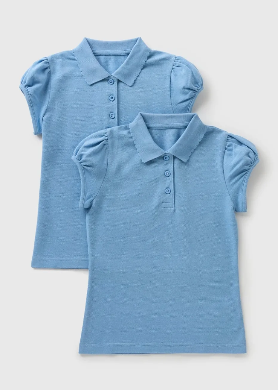 Stock up on girls school staples with this two pack of pretty polo shirts. Made from soft and comfortable 100% cotton, the white polo shirt duo have puffed cap sleeves, a girly scalloped collar and a classic three button placket.