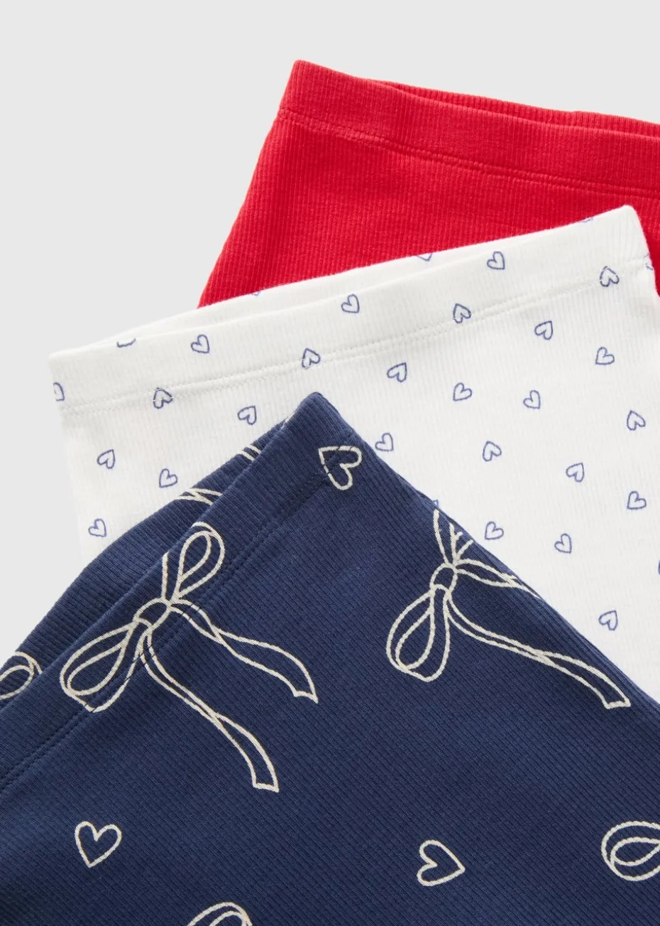 Your little one will look adorable in our stylish and comfortable 3 Pack Baby Multicolour Heart Bow Leggings. These versatile leggings are made from a soft and stretchy cotton blend and come in a pretty navy, red and white colour. They feature an elasticated waistband for a snug and comfortable fit and are perfect for active little ones.