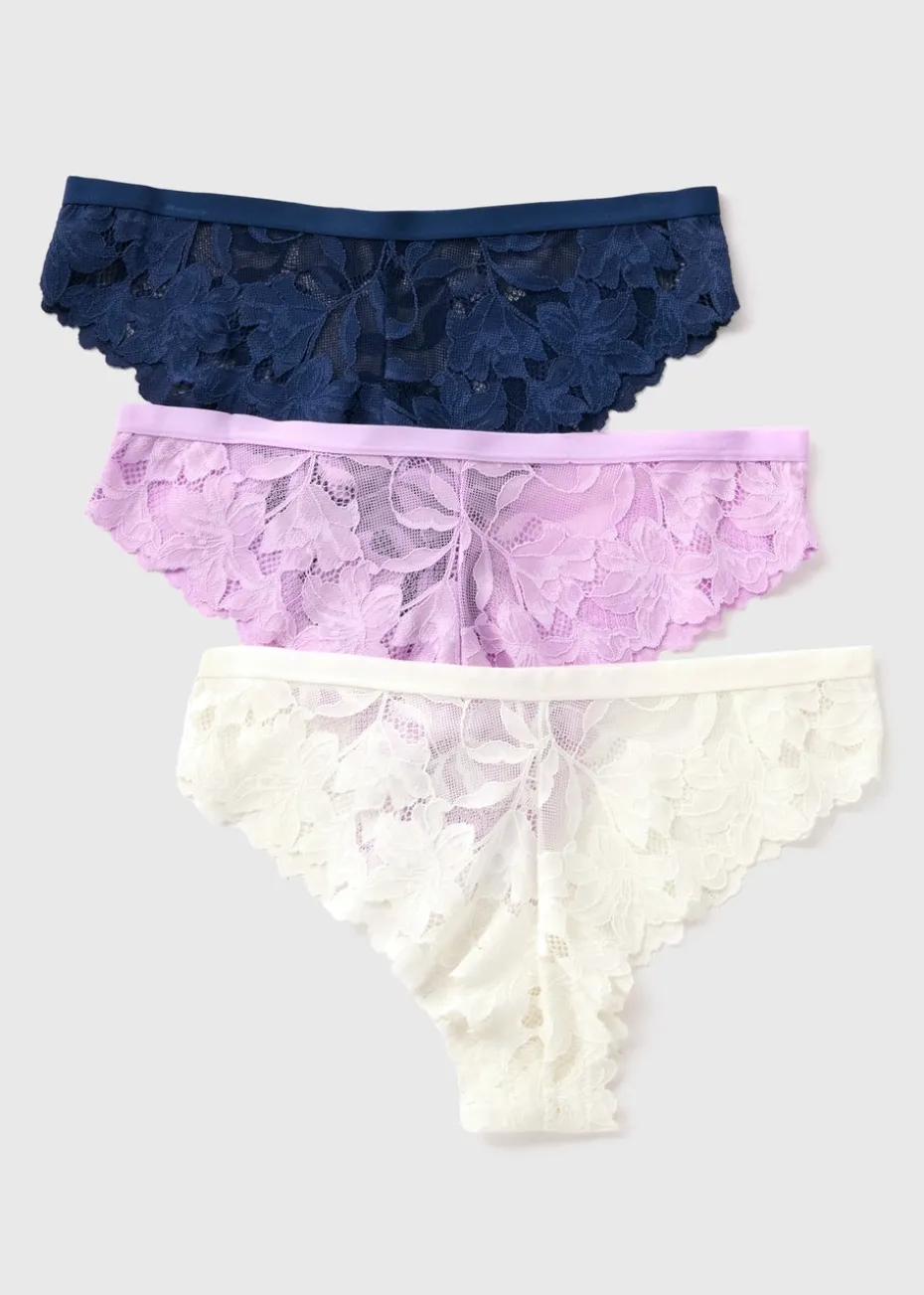 Discover our captivating 3 Pack Multicoloured Lace Brazilian Knickers, a must-have addition to your lingerie collection. Crafted from comfortable material, these Brazilian briefs exude elegance and sensuality. Each pack includes three pairs, blending delicate lilac, navy and cream.