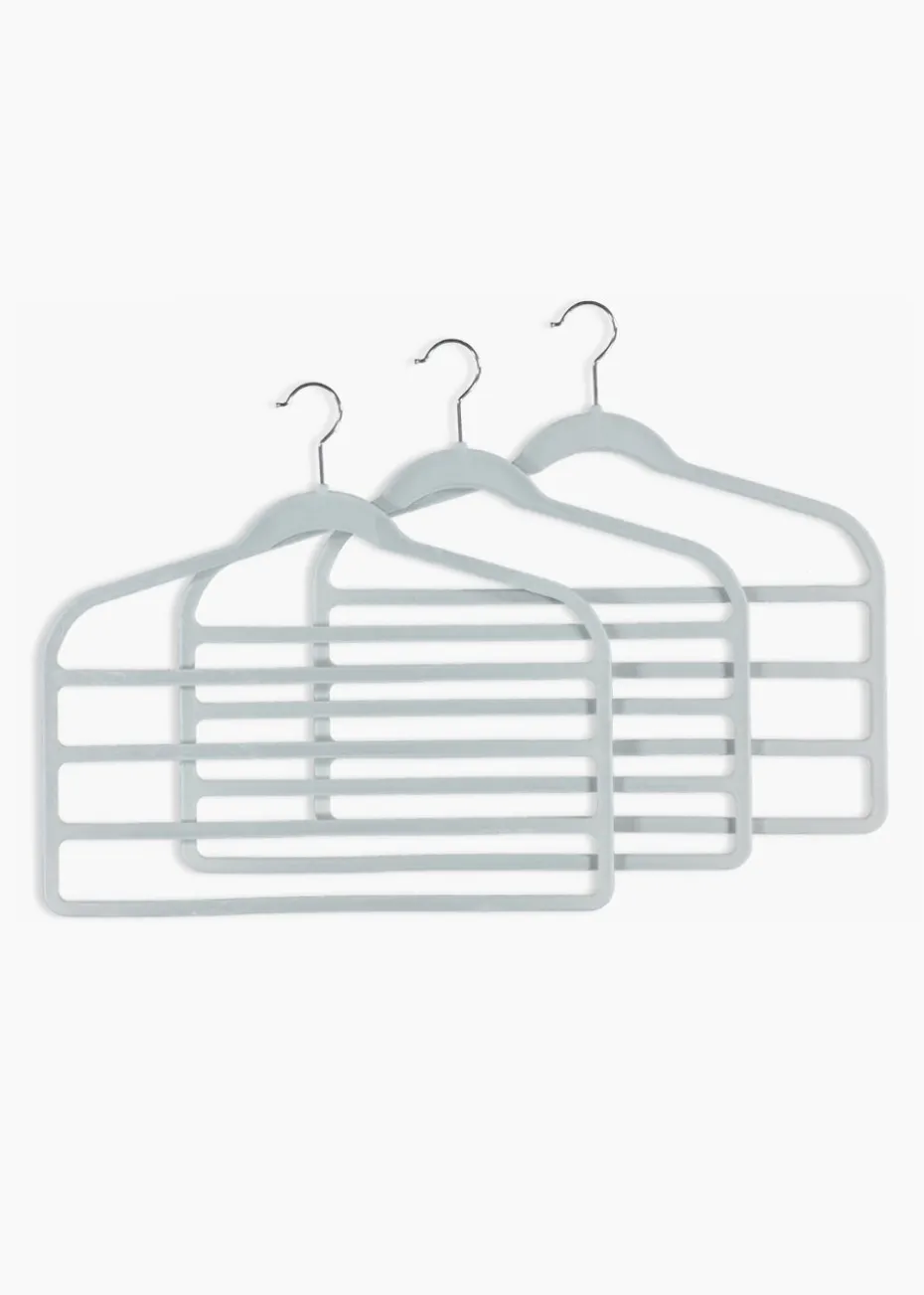 Keep your wardrobe organised with this pack of 3 hangers. Styled in grey with silver hooks and a velour finish to keep clothes in place and prevent slipping, each hanger comes with three trouser slots making them a great space-saving solution.