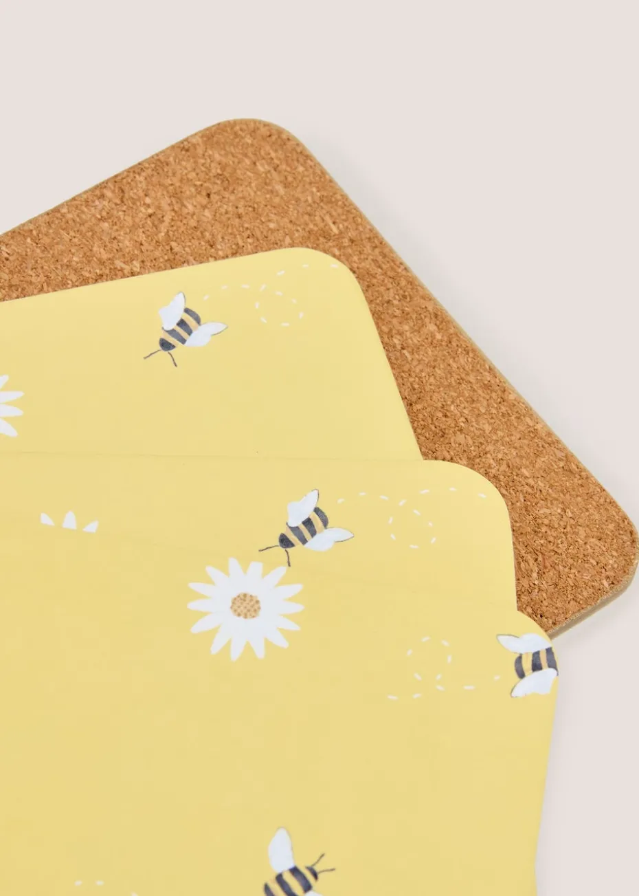 The sunny yellow backdrop is adorned with charming cartoon flowers and bees, adding a delightful touch to your home decor. Protect your surfaces in style with these adorable coasters that bring a burst of joy to any setting.