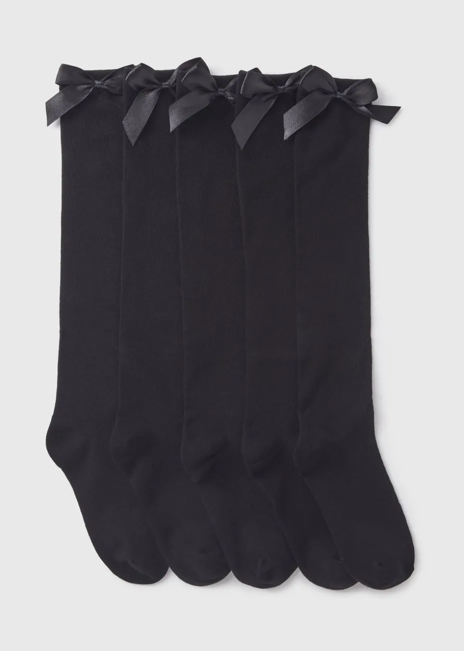 Add a touch of charm to your sock drawer with this 5 Pack of Black Bow Knee High Socks. Designed for both style and comfort, these socks feature a classic knee-high length with delicate bow detailing for a playful, feminine finish. The black hue makes them effortlessly versatile, perfect for pairing with skirts, dresses, or layering under boots.