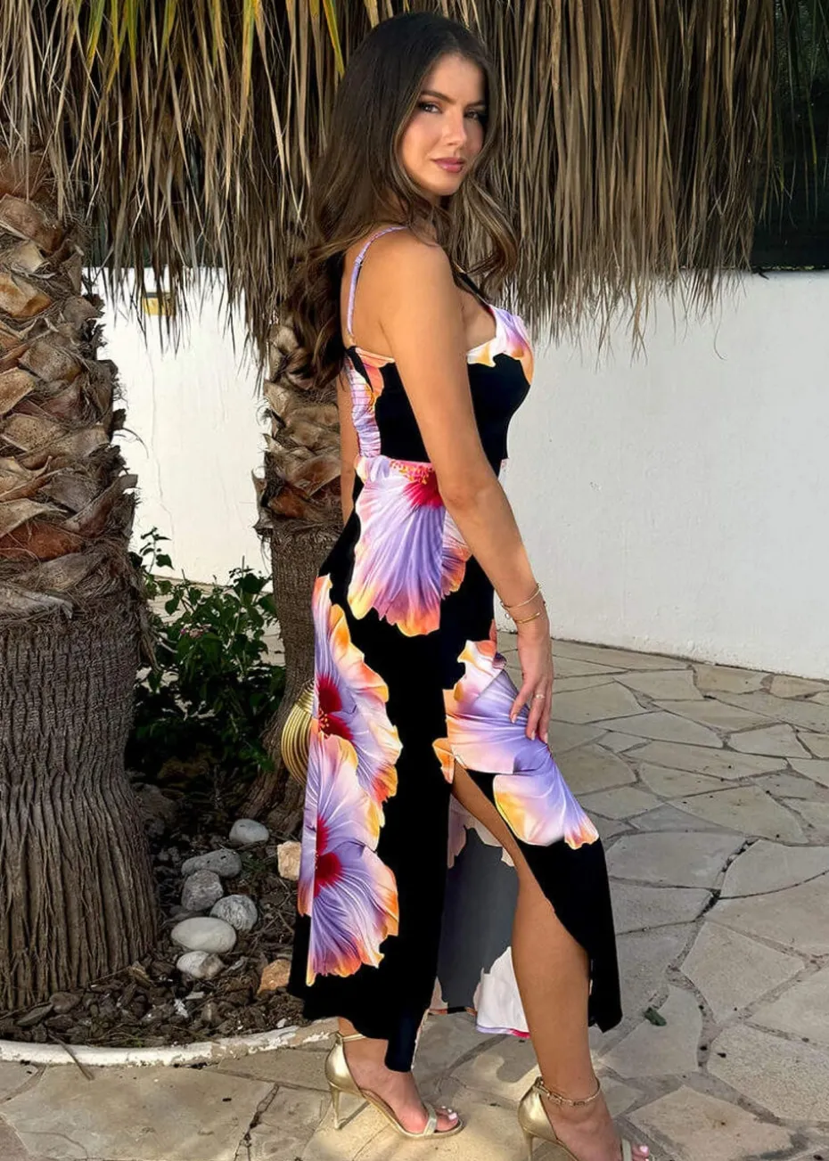 Embrace your glamorous side with our Black And Lilac Floral Print Strappy Slip Midi Dress. Featuring a straight neckline, adjustable straps, a shirred back top, a zip-up side and a midi skirt with a double split. Style with heels and a matching bag for the perfect summer evening outfit. Model wears: UK 8/ EU 36/ US 4 Model’s height: 173cm/ 5’8″ Approx length from centre back to hem: 115 cm Fabric composition: 100% Polyester Colour: BLACK *print position may vary*