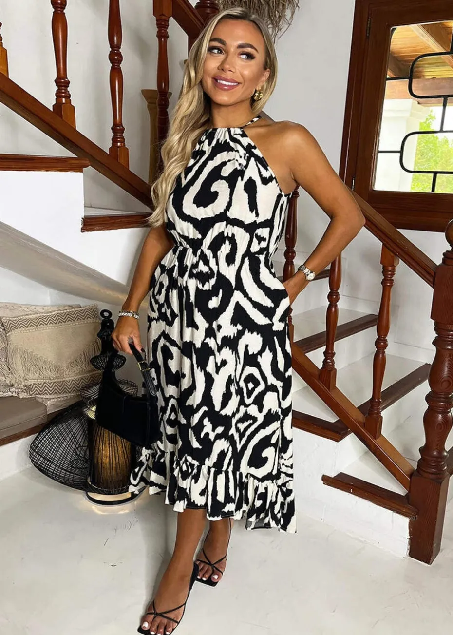 Be the first to review “AX Paris Black And White Abstract Print Racer Neck Frill Hem Midi Dress” Cancel reply