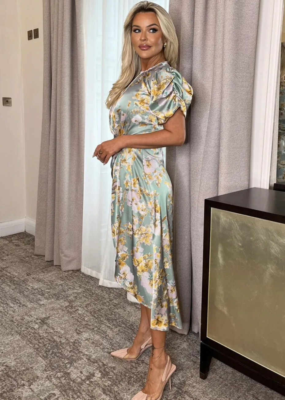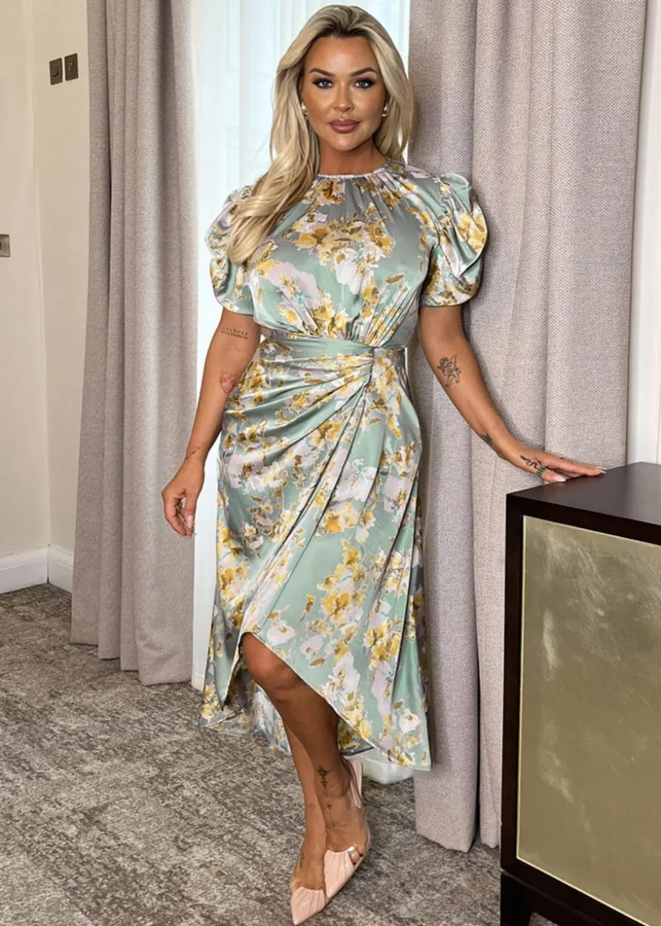 Feel sophisticated in our Duck Egg Floral Print Puff Sleeve Gathered Side Midi Dress. Featuring our gorgeous satin-feel fabric, puff sleeves, a round pleated neckline, an elasticated back waist, a draped midi length skirt with a gathered side detail and a zip up back. Style with flats or heels and add some sophisticated jewellery for a chic evening look. Model wears: UK 8/ EU 36/ US 4 Model’s height: 175cm/ 5’9″ Approx length from centre back to hem: 135 cm Fabric composition: 100% Polyester Colour: DUCK EGG *print position may vary*