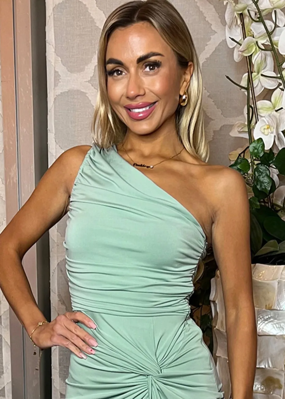 Got a special occasion to attend? Then look no further than this duck egg midi dress from AX Paris. Featuring a statement one shoulder design, a ruched top, a side zip and a knot front draped skirt with slit and lining. Style with statement heels and minimal accessories to complete the look. Model’s height: 165cm/ 5’5″ .Model wears size 8
