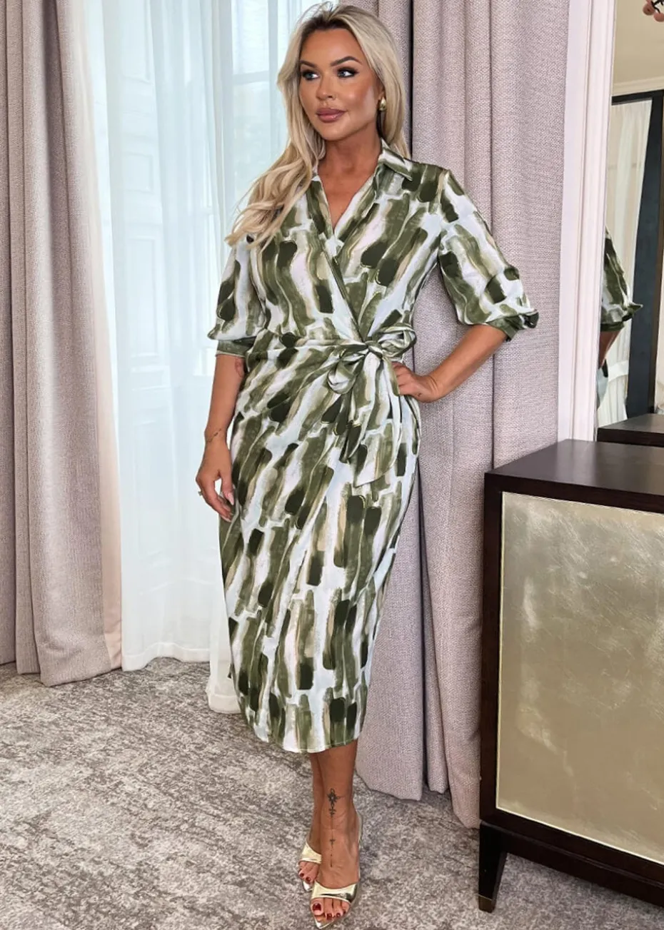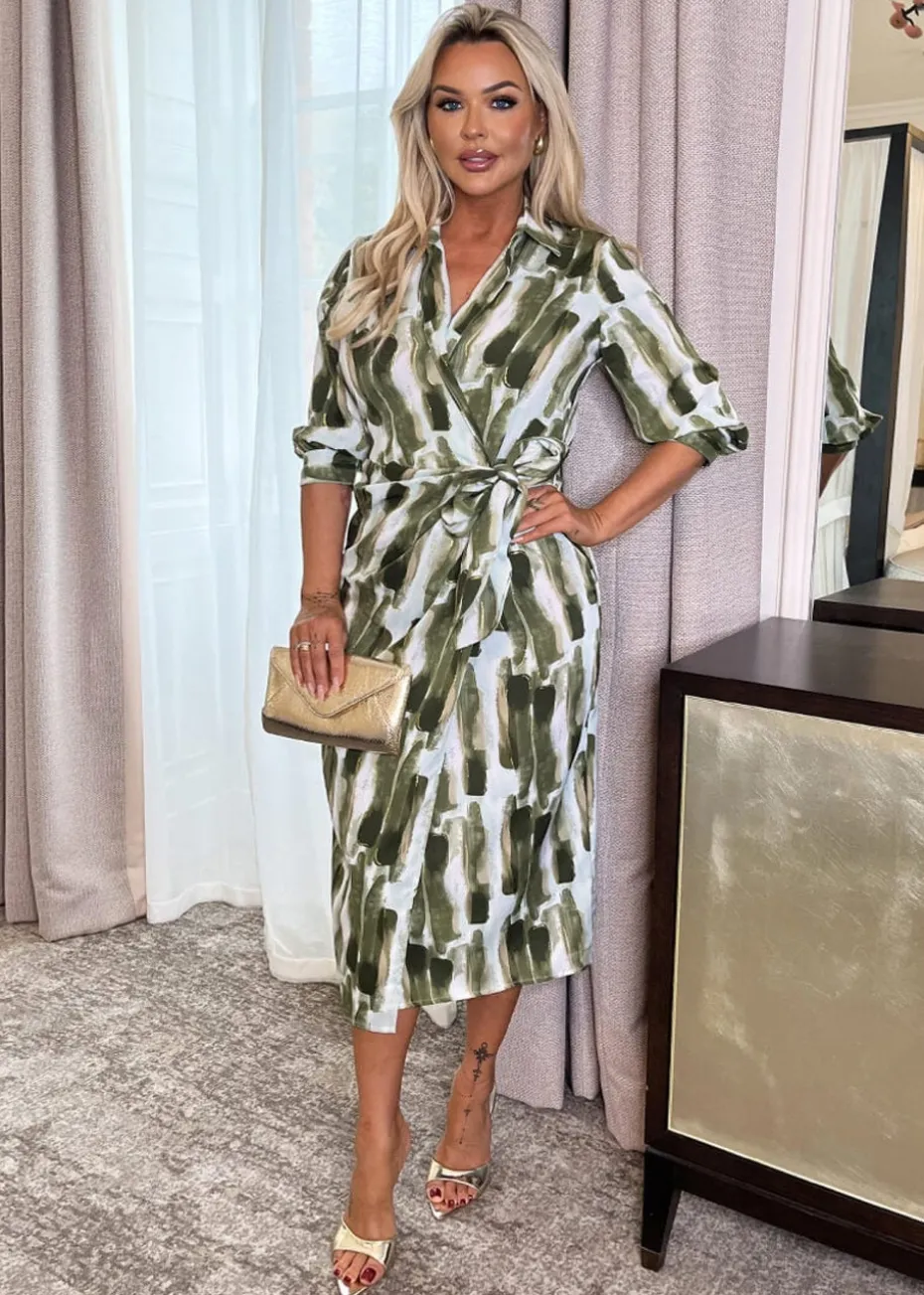 Make a statement in our Khaki Brush Stroke Print 3/4 Sleeve Tie Waist Wrap Shirt Midi Dress. Featuring a stunning brush stroke print with gold detailing, a classic collar, 3/4 cuffed sleeves, a wrap top with snap button closure, a side tie and elasticated back waist. Style with heels and a matching bag to complete the look. Model wears: UK 8/ EU 36/ US 4 Model’s height: 175cm/ 5’9″ Approx length from centre back to hem: 130 cm Fabric composition: 100% Polyester Colour: KHAKI *Print position may vary*