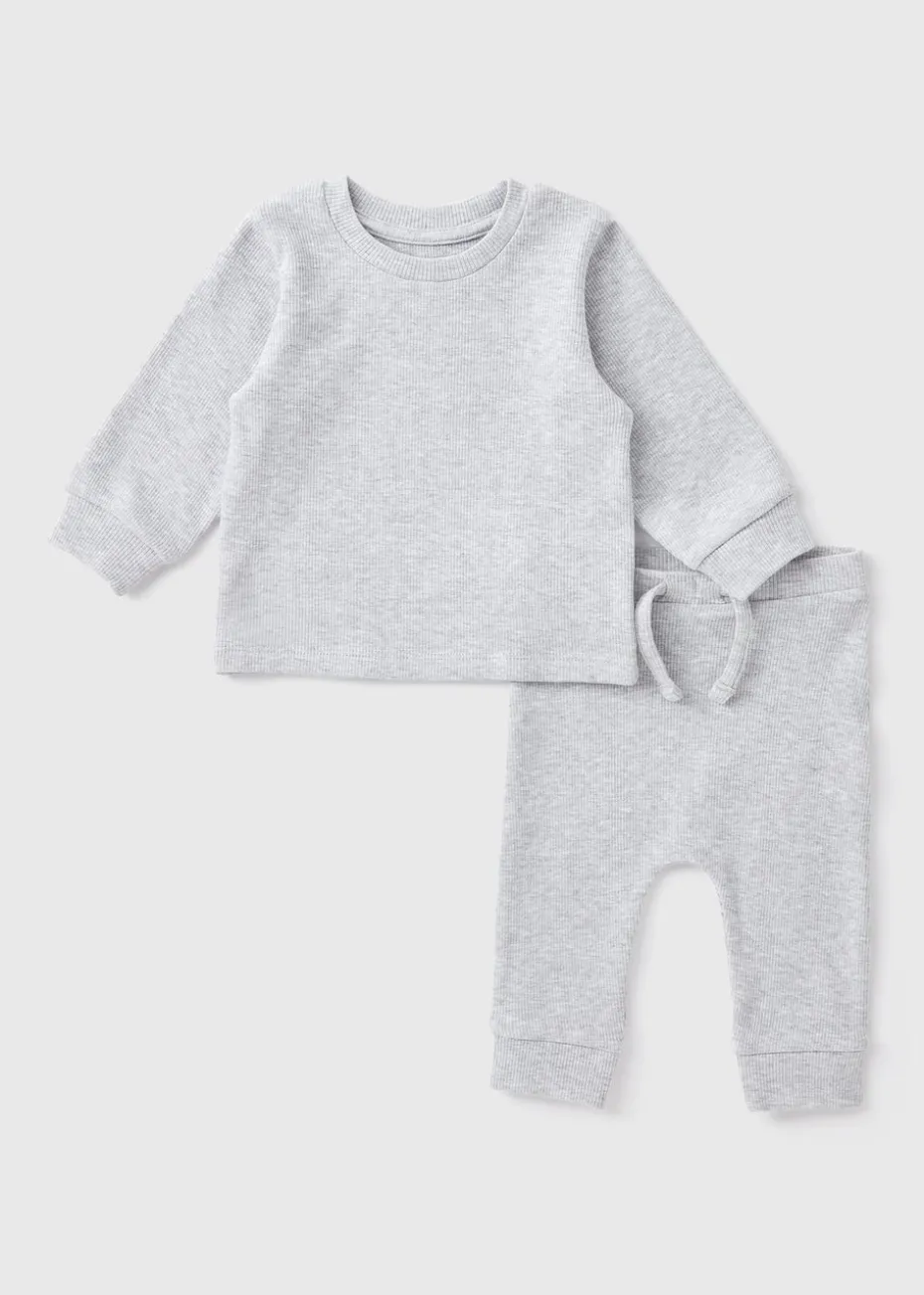 This grey ribbed top and leggings set is a staple for your little ones wardrobe. With ribbed material and cuffed ankles your little one with have a snug and comfortable outfit for any playtime adventures. The long sleeves and full length bottoms mean this is a perfect cosy set for any day wear. Perfect for layering or wearing alone, this set is a versatile addition to any child’s wardrobe.