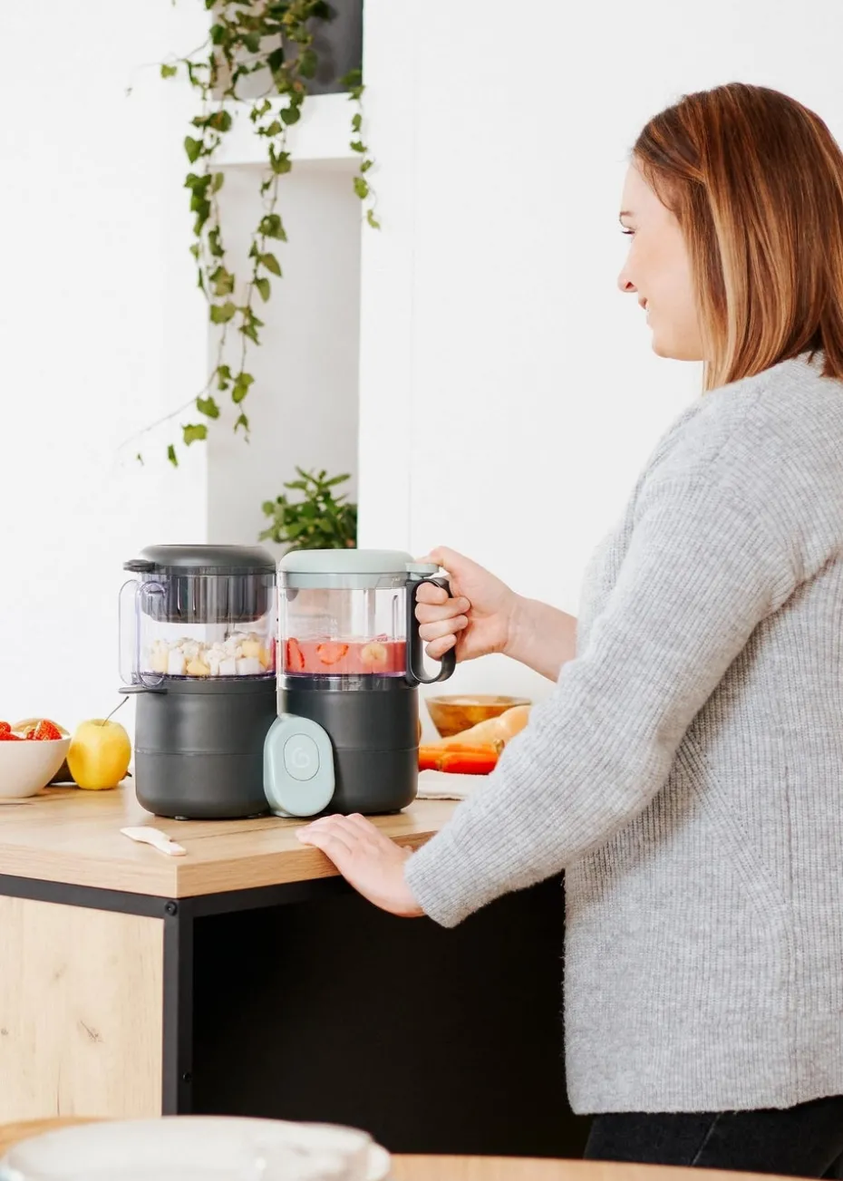 It is really easy to use every day. Pour in the correct quantity of water and start the cooking or defrosting process using the central button. There’s nothing to programme in! Blending is just as easy.The Nutribaby One multi-purpose food processor has a large total capacity of 2,000 ml (1,300 ml for cooking and 700 ml for blending). You can cook and blend simultaneously!