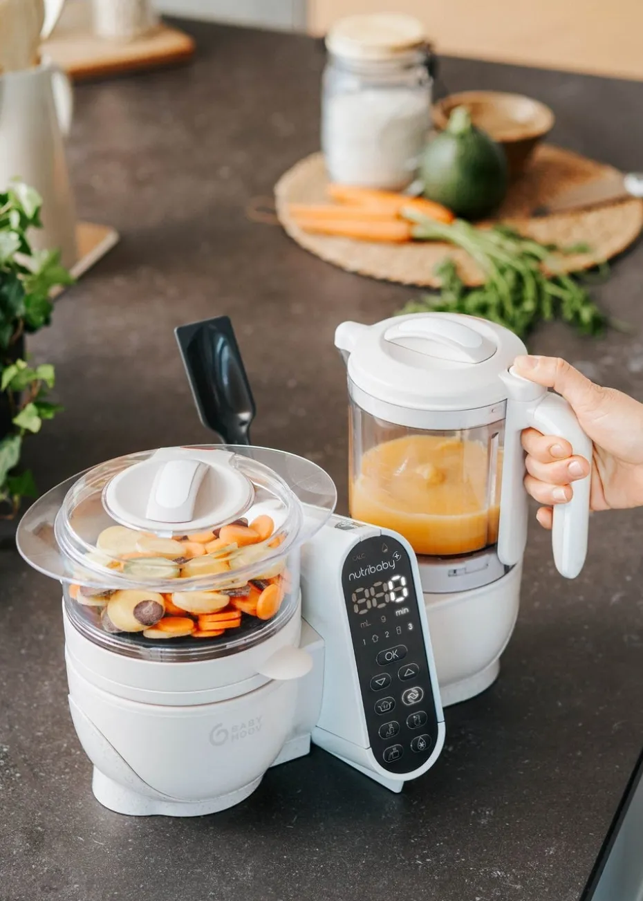 The Nutribaby(+) multi-purpose food processor is ideal for all stages of your child’s development, from bottle-feeding to weaning and beyond. The multi-purpose Nutribaby(+) features 6 automatic programmes, with 1 button = 1 function: steam cooking, blending, defrosting, heating baby food jars, sterilising and heating baby bottles. This food processor also features a central touchscreen console and a built-in timer (audible and visual alarm, automatic cut-off).