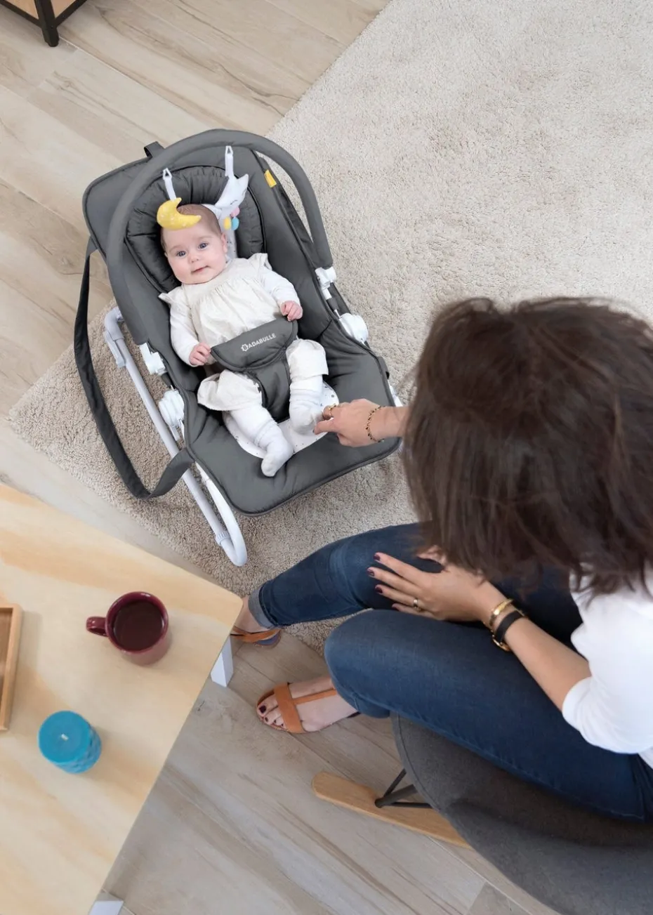 Perfect right from birth, the seat on the bouncer is soft and cushioned. Your baby is well supported with the detachable anatomical headrest and 3-point safety harness. The backrest reclines to 5 positions to suit all ages and situations. You can use this baby bouncer in a fixed position or as a rocker – it’s up to you! The feet can be lifted up at the back of the bouncer to create a gentle rocking motion.