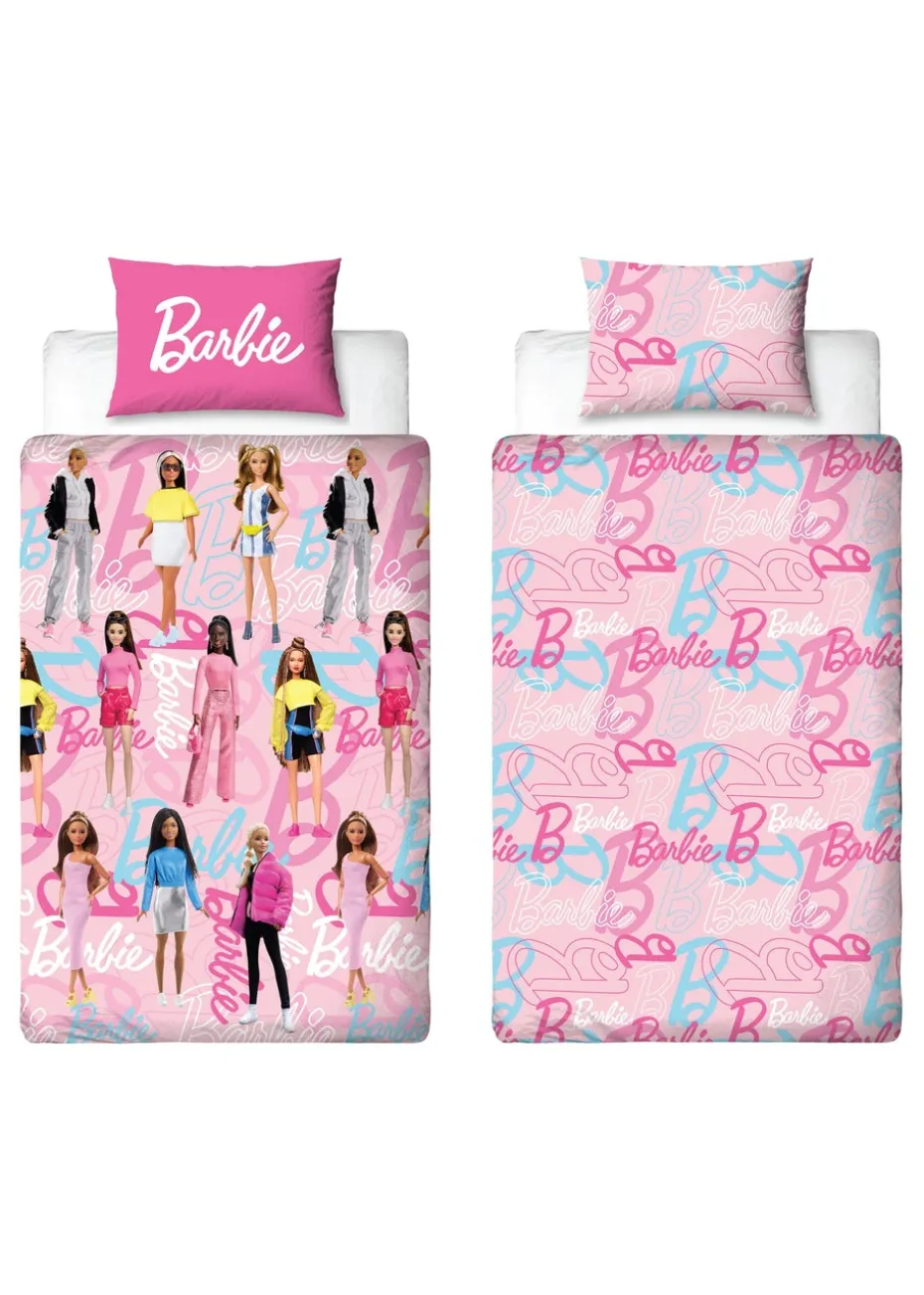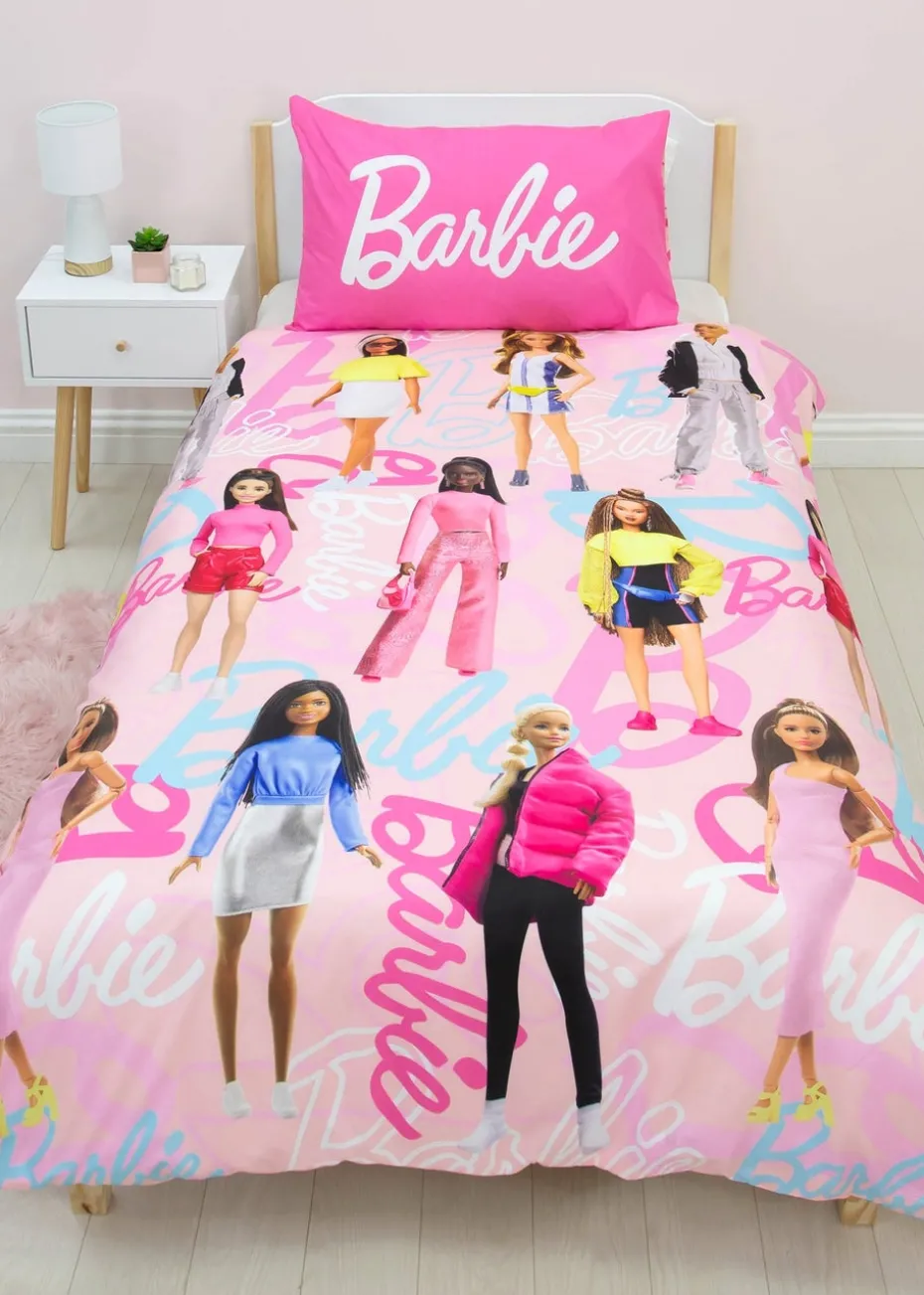 The bedding set is designed for double beds and includes a reversable double duvet cover and two reversable pillowcases, Single duvet cover set includes single duvet and one pillow case, so you can easily freshen up the look of your child’s bedroom. The front side of the duvet cover features a repeating pattern of multiple Barbie dolls in different colourful outfits, laid on top of various Barbie logos and a powder pink background.