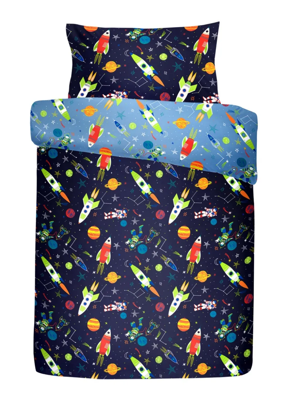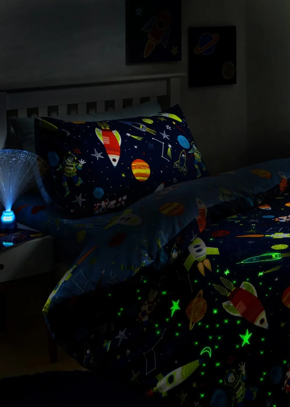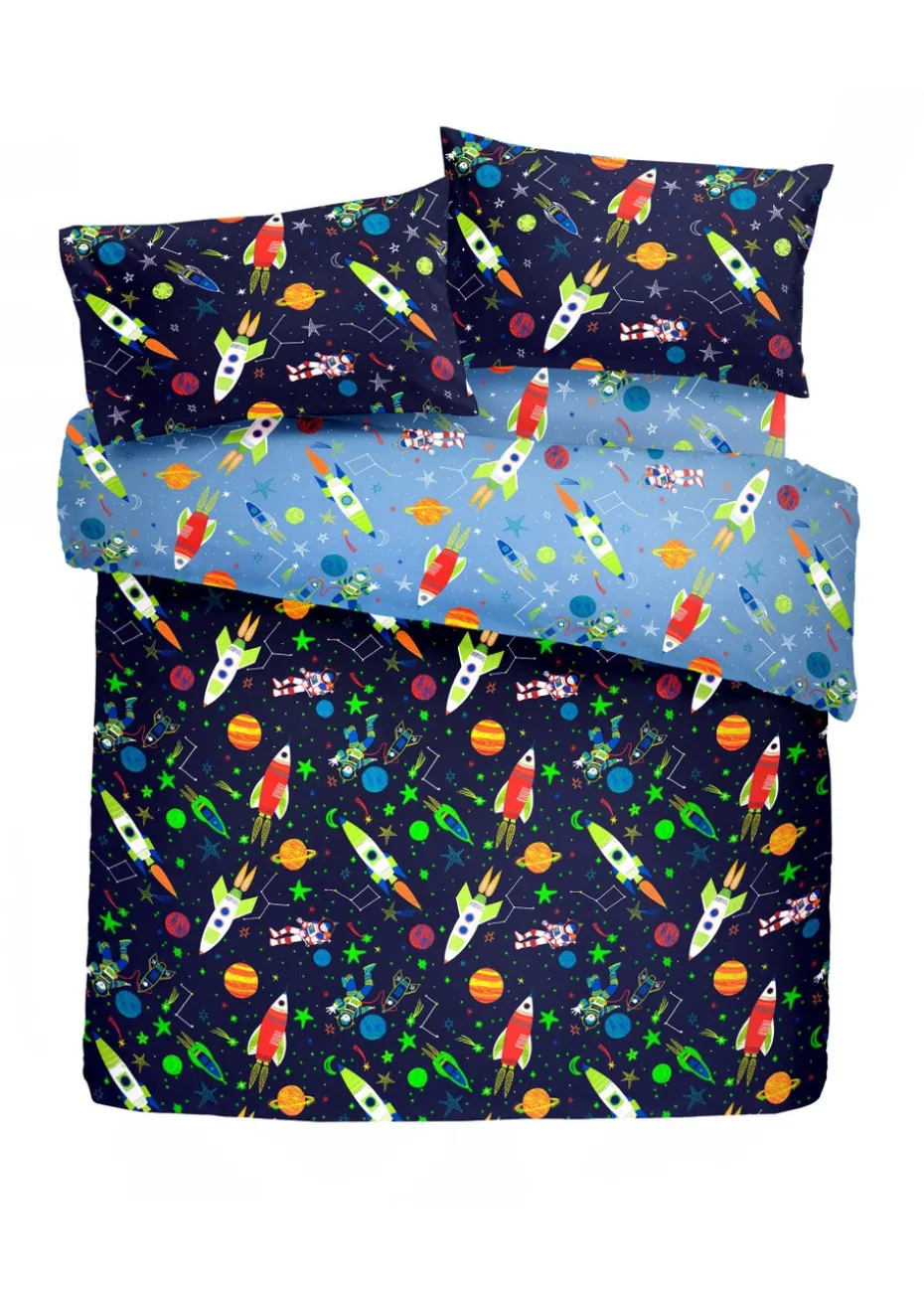 Explode into space and float amongst the stars with this fantastic and fun bedding range. The duvet cover and co-ordinating curtains have an amazing glow in the dark feature that is guaranteed to bring a smile to any young astronauts face. Printed fitted sheets are also available to complete the look.