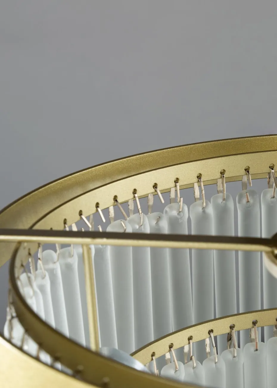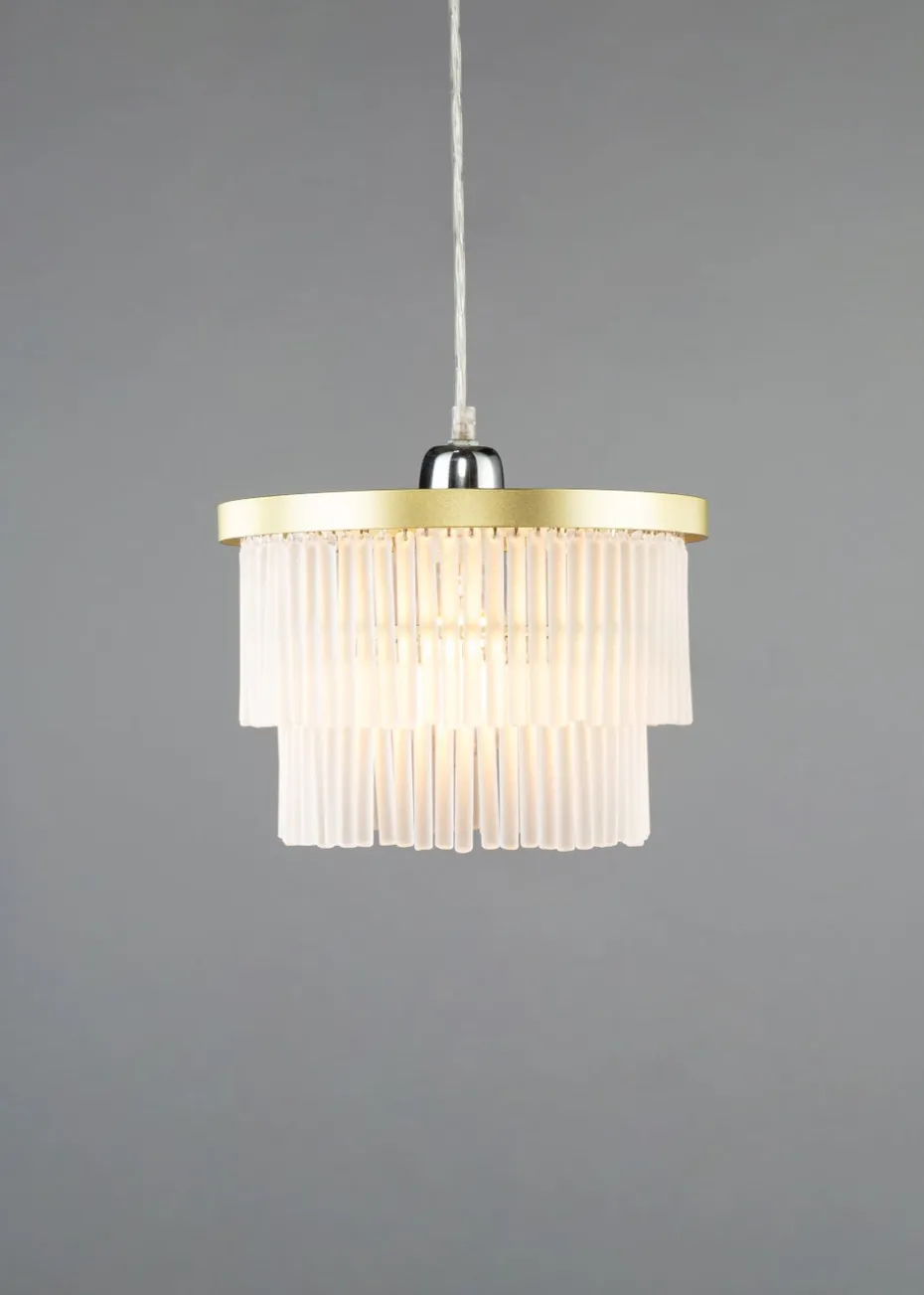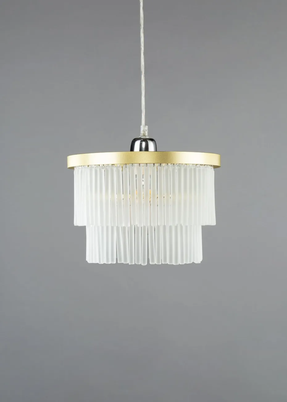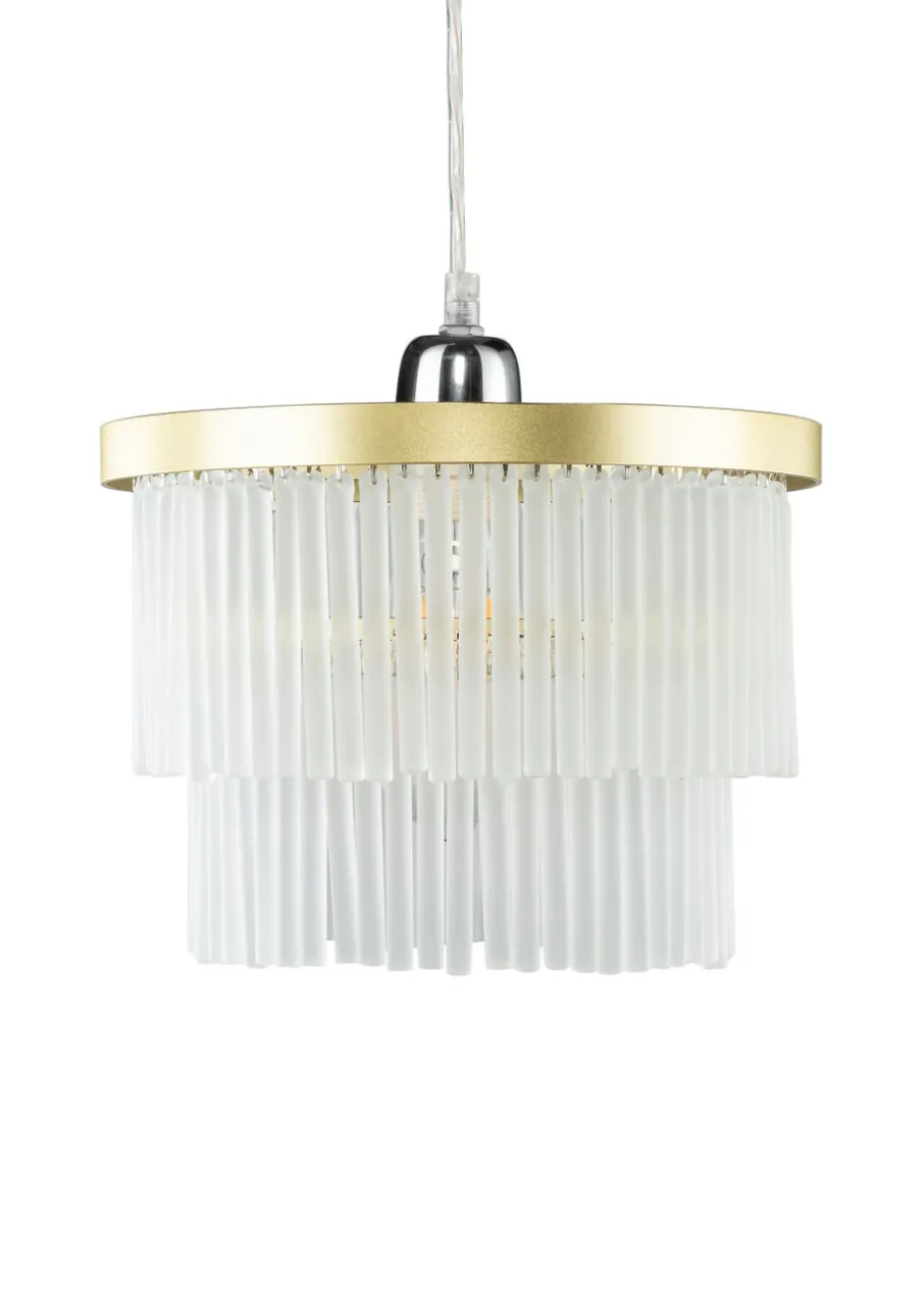A stylish tiered easyfit light in a brass finish with frosted glass rods, adds elegance and a perfect centrepiece in any living room, dinig area or bedroom. Bulb type: 1 x 10W LED (not included). Height 19cm x Width 25cm