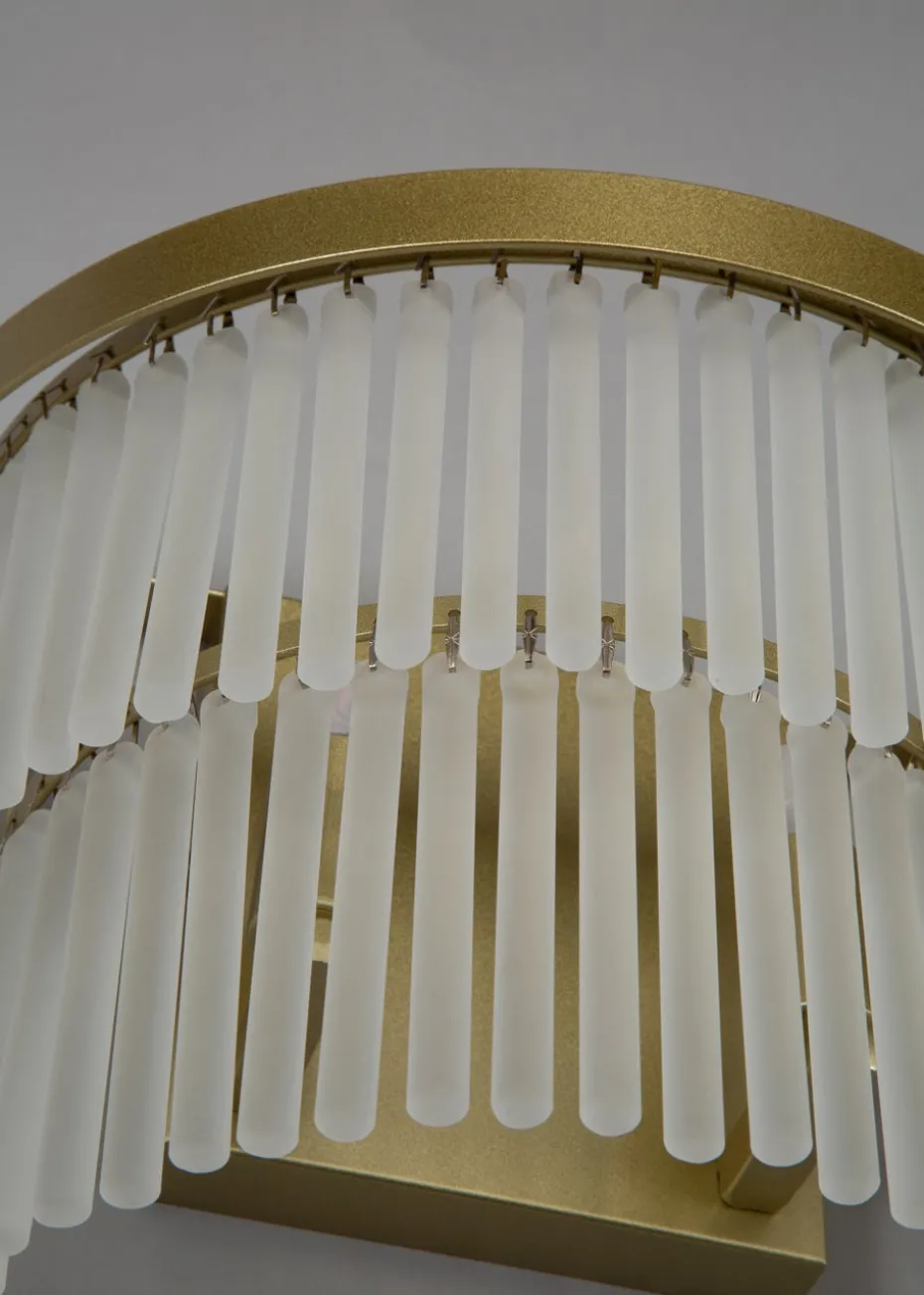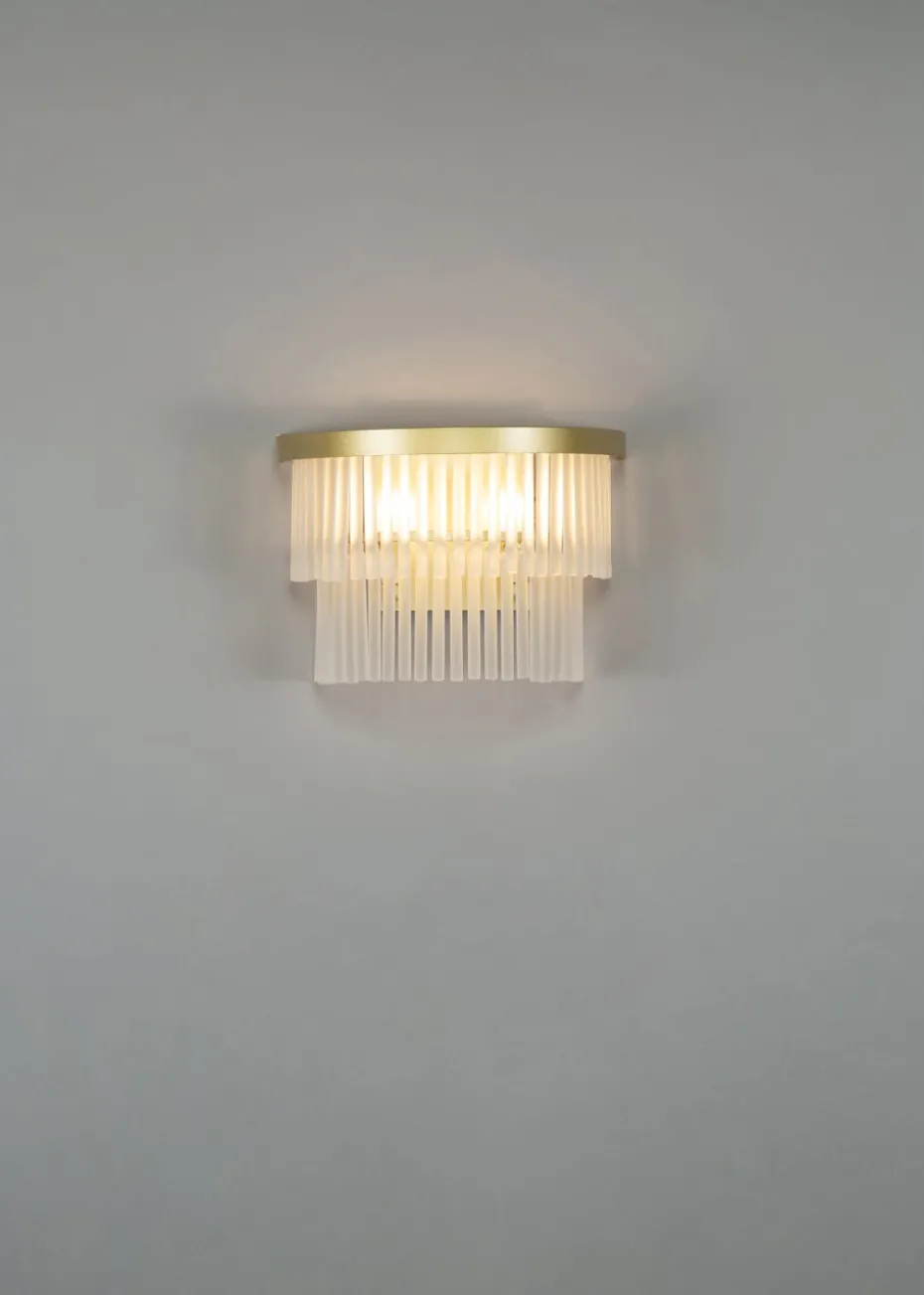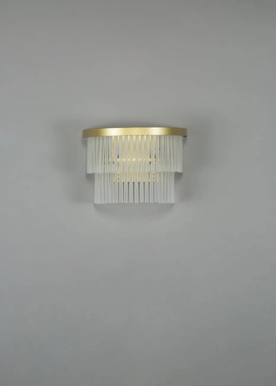 A stylish tiered wall light in a brass finish with frosted glass rods, adds elegance and a perfect centrepiece in any living room, dinig area or bedroom. Bulb type: 3 x G9 (not included). Height 19cm x Width 26cm.
