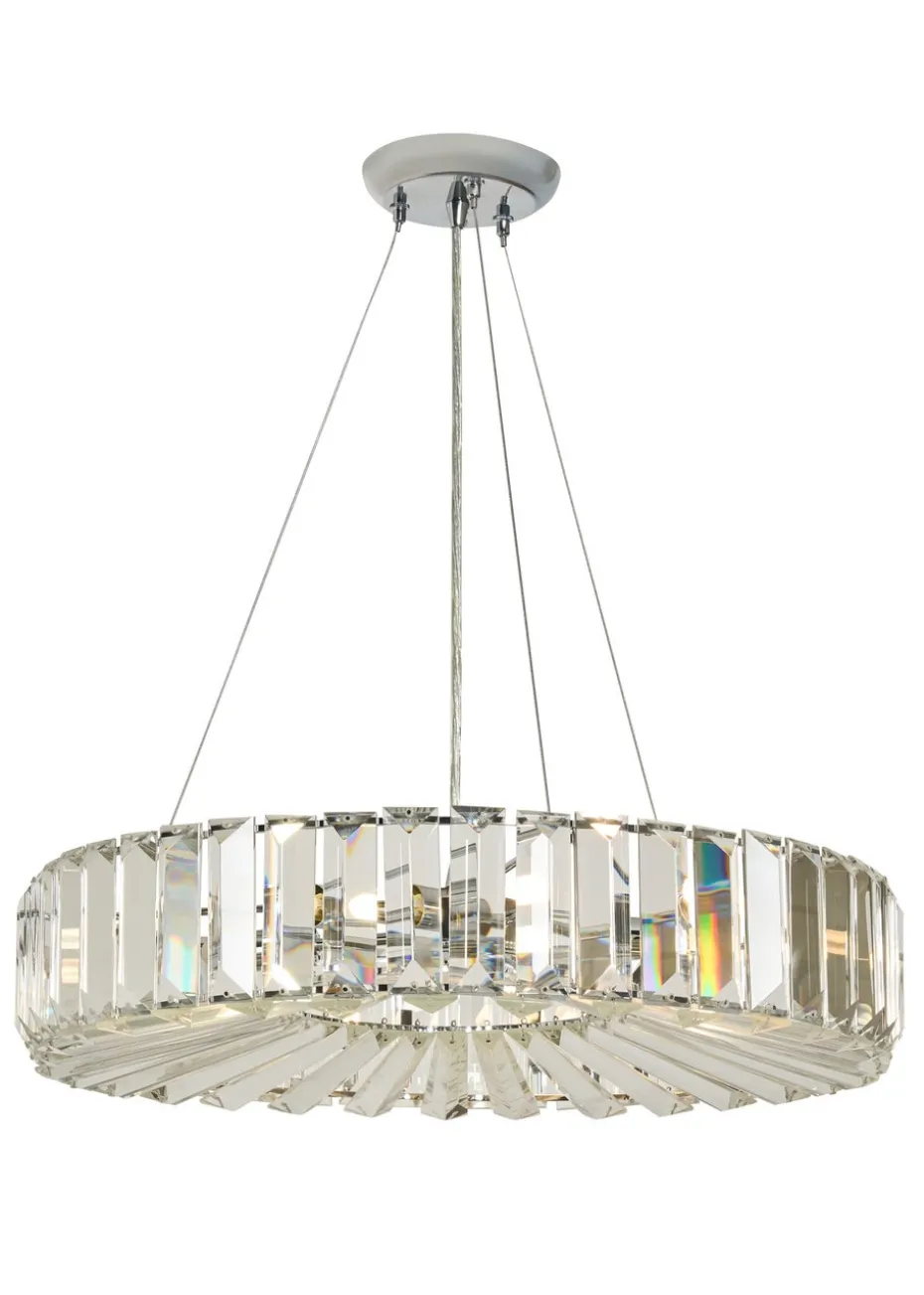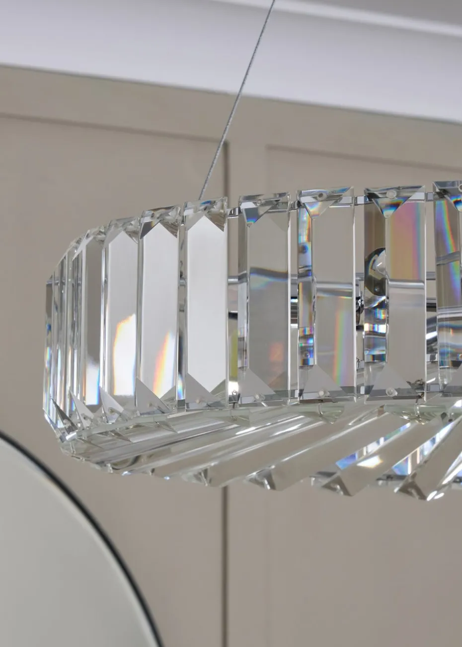 The BHS Renee Crystal Pendant in Chrome is an elegant and sophisticated lighting fixture designed to add a touch of luxury and sparkle to any room. With its stunning crystal accents and sleek chrome finish, this pendant light creates a captivating focal point, enhancing the overall aesthetic of your space. Adjustable Height 35-115cm x Width 50cm. Requires 5 x G9 bulbs, not included.