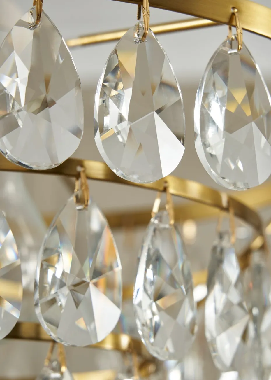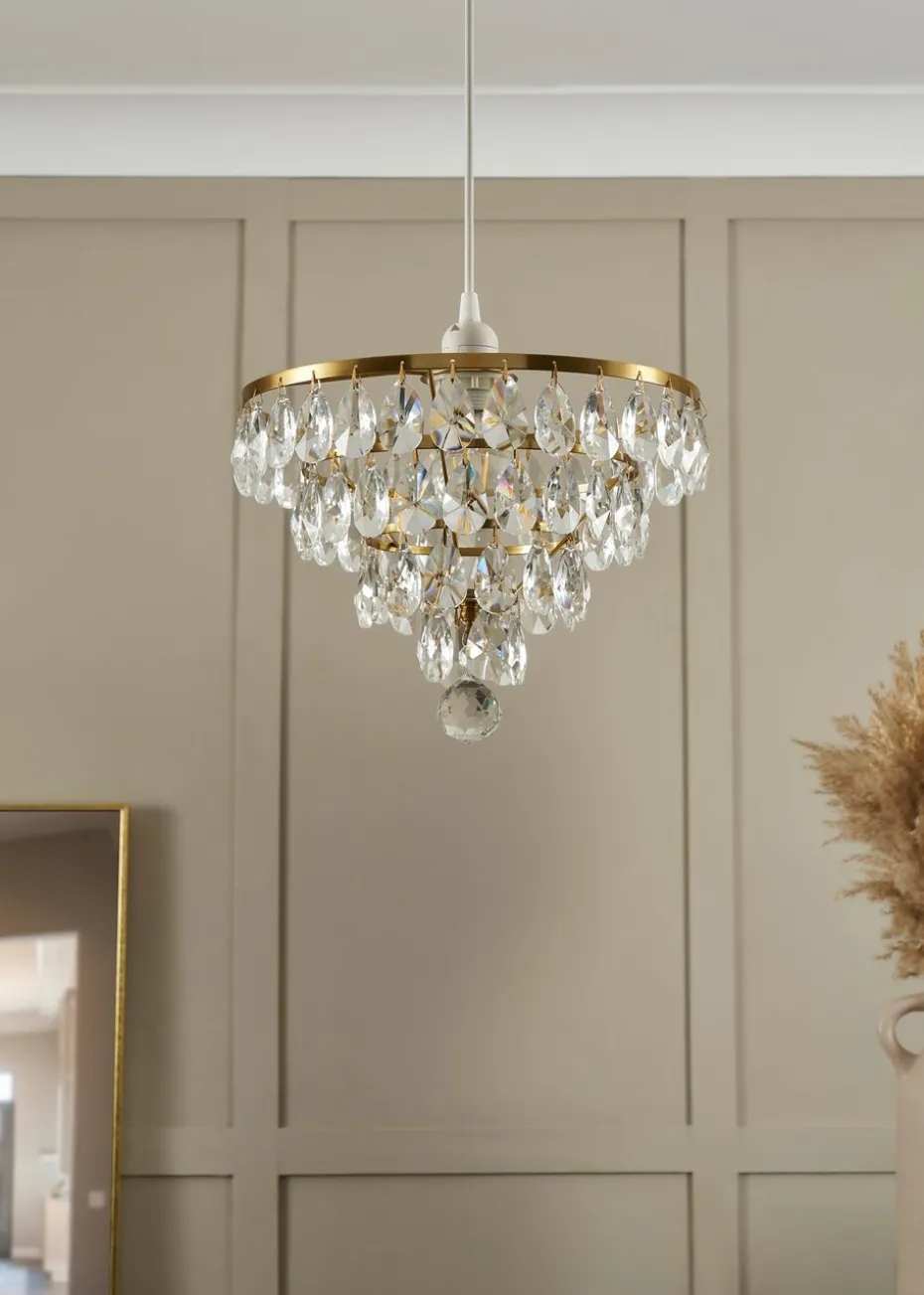 Add a touch of glamour and elegance to your home with the BHS ELIANIS Tiered Easyfit Shade. Featuring a stunning brass frame adorned with cascading glass droplets, this shade creates a dazzling effect when illuminated, adding a luxurious feel to any space. Height 21cm x Width 30cm.