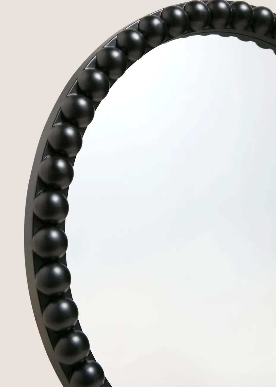 A distinctive take on the traditional mirror, this round mirror is a unique way to add depth and dimension to any room. The Black Bobble Mirror is an eye-catching addition to any home, featuring bobble detailing all round the mirror, adding some style and depth to your décor. Enhance your décor with this modern touch in any room.