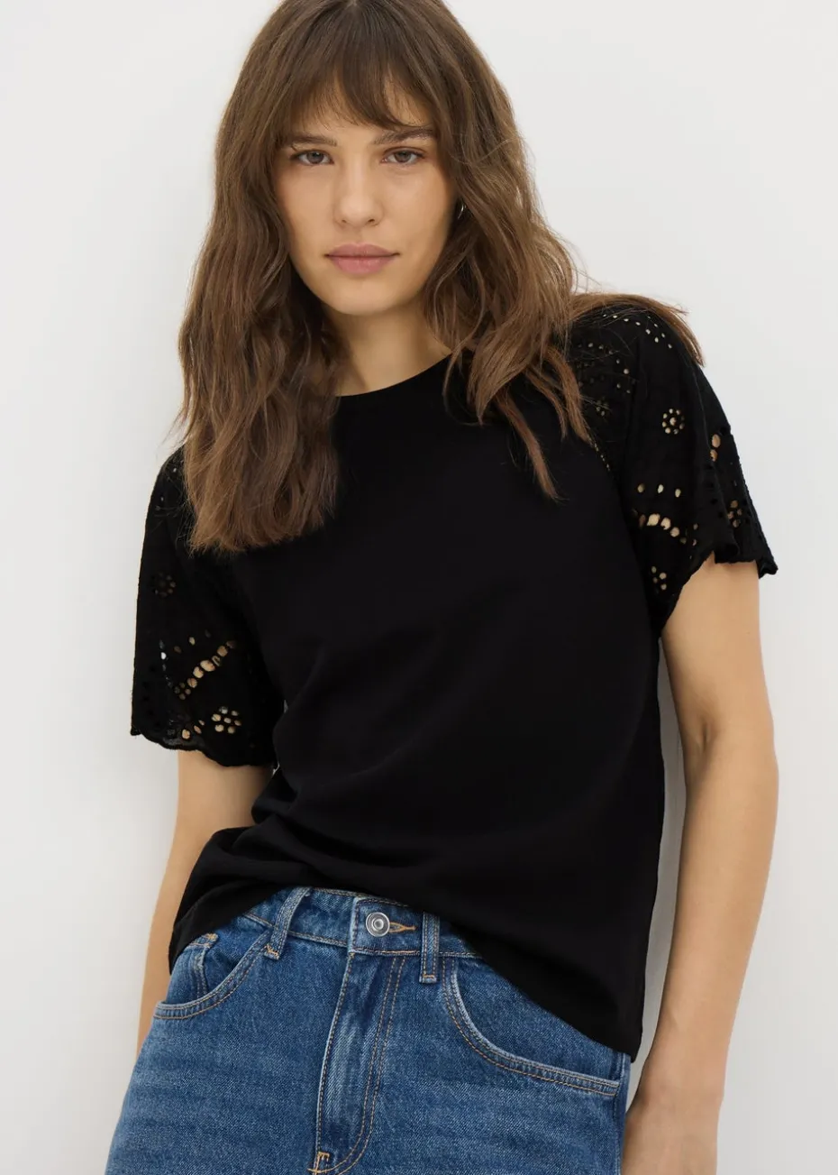 Feminine meets effortless in the Black Broderie Raglan Sleeve T-Shirt. Featuring delicate embroidered details and soft raglan sleeves, this piece adds a touch of texture and charm to your everyday lookâperfectly polished, yet easy to wear.