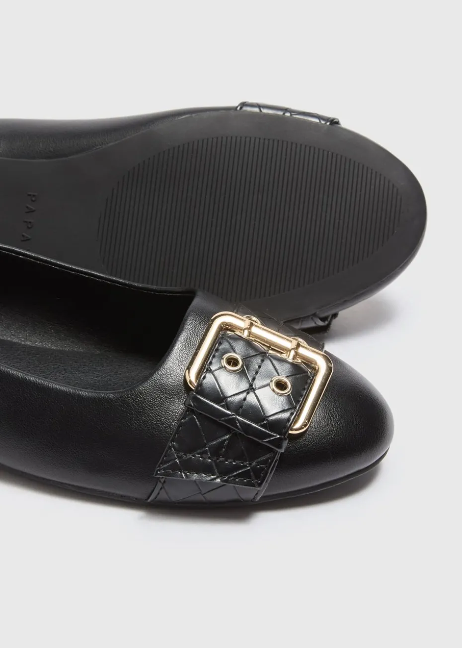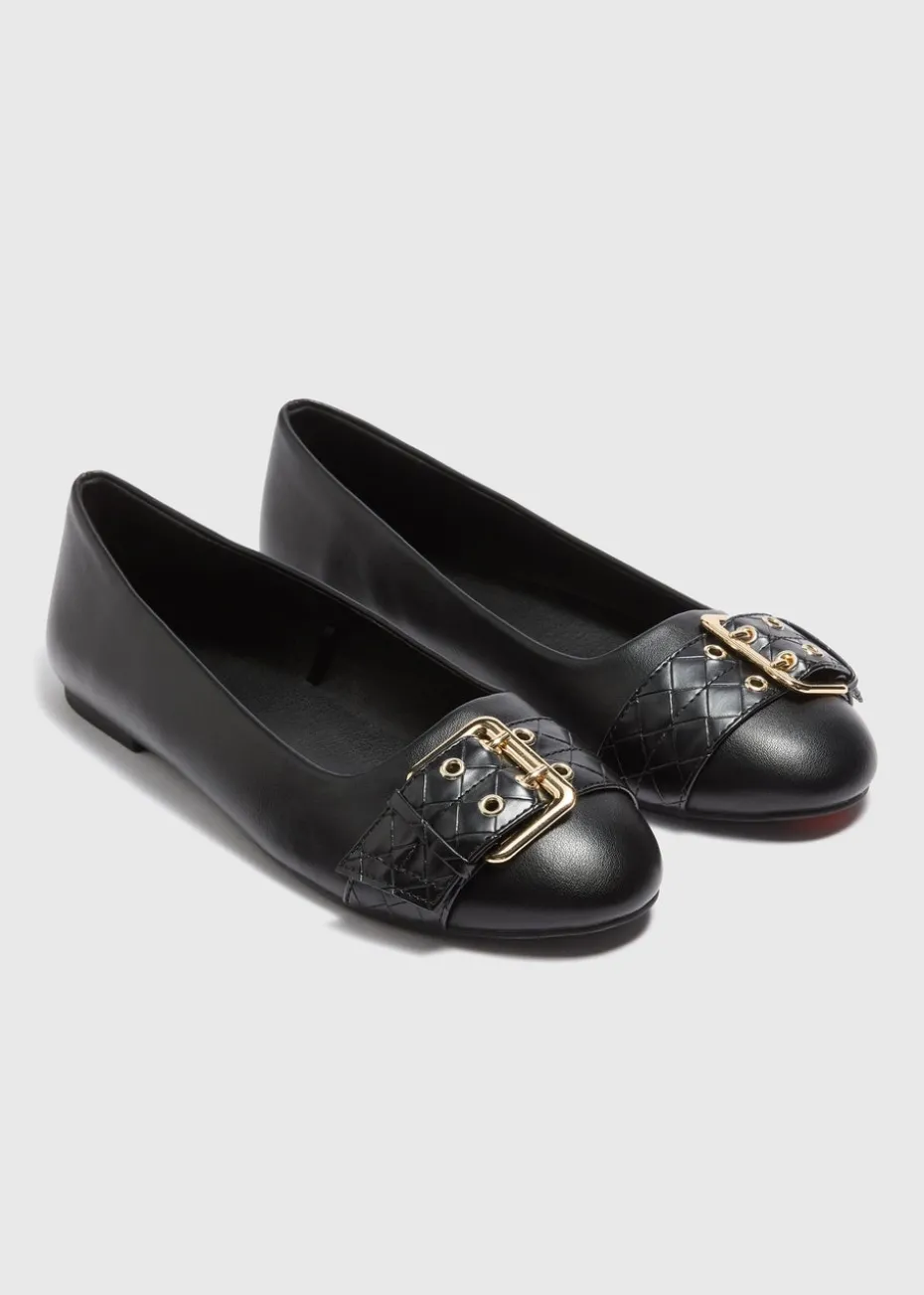 Step into effortless elegance with the Black Buckle Detail Ballet Flats. Designed with a sleek, minimalist silhouette, these ballet flats offer both comfort and style. The classin colour complements a wide range of outfits, while the buckle detailing adds a sophisticated touch to the classic design.