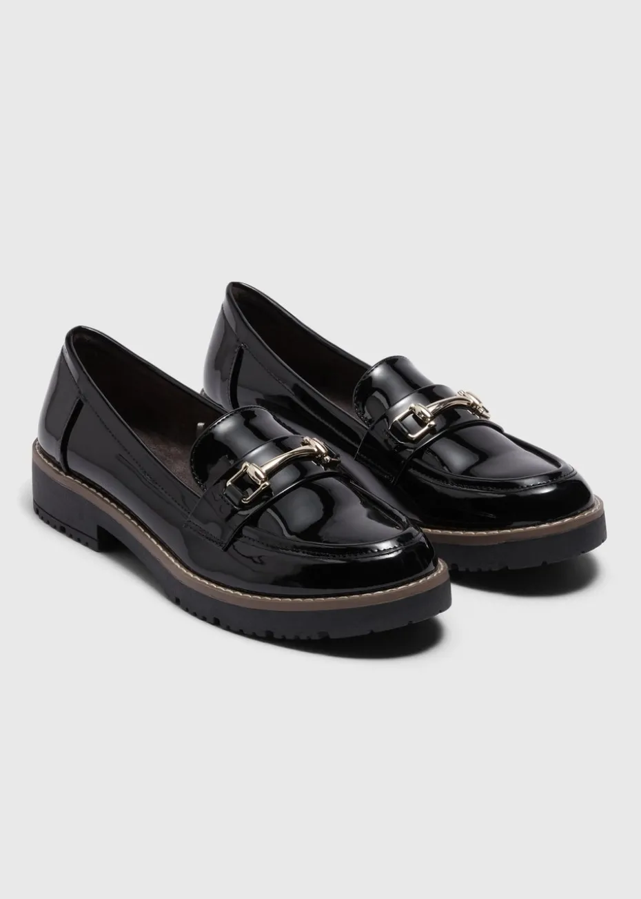 Step up your everyday style with the Women’s Black Chain Loafers, where classic design meets modern edge. Crafted in a sleek black finish with a bold metallic chain buckle detail across the front, these loafers add instant polish to any outfit. The low heel and cushioned insole ensure comfort without compromising on style.