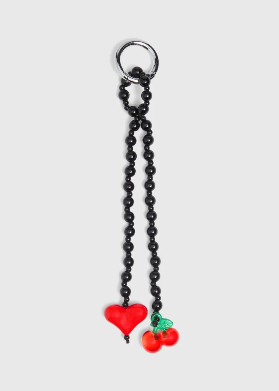Add a splash of colour to your accessories with our Black Cherry Bead Keyring. This delightful accessory features intricately crafted cherry and heart shaped details, with black beads, radiating both elegance and a playful charm. Designed to elevate your personal style, it will become a cherished addition to your accessory collection.
