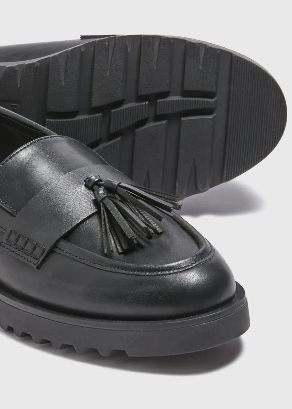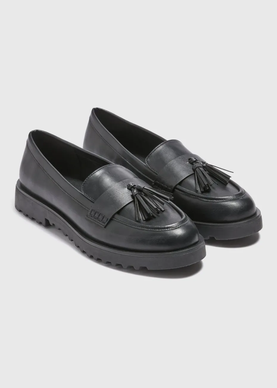 Step up your footwear game with our Black Chunky Tassel Loafers. These stylish shoes feature a bold, chunky sole for added height and comfort, while the classic loafer silhouette is updated with chic tassel detailing for a modern twist. Crafted from high-quality materials, they offer both durability and a sleek, polished look.
