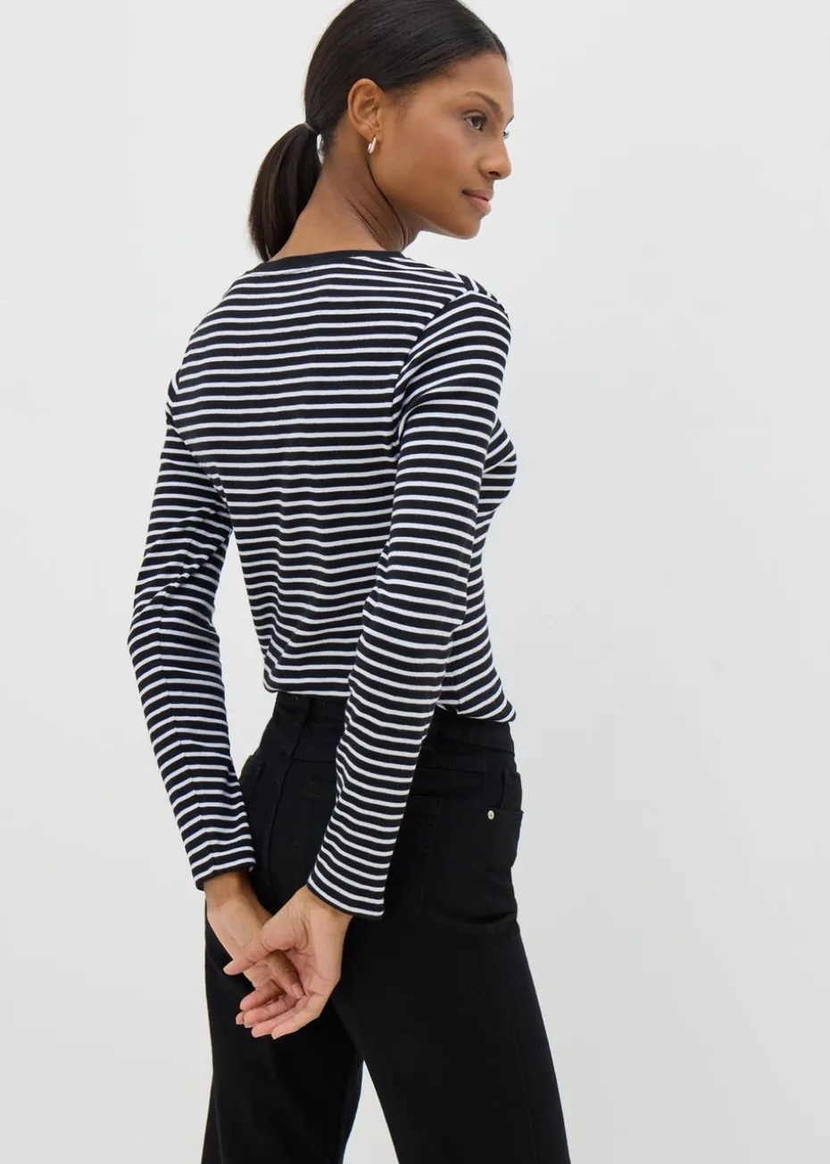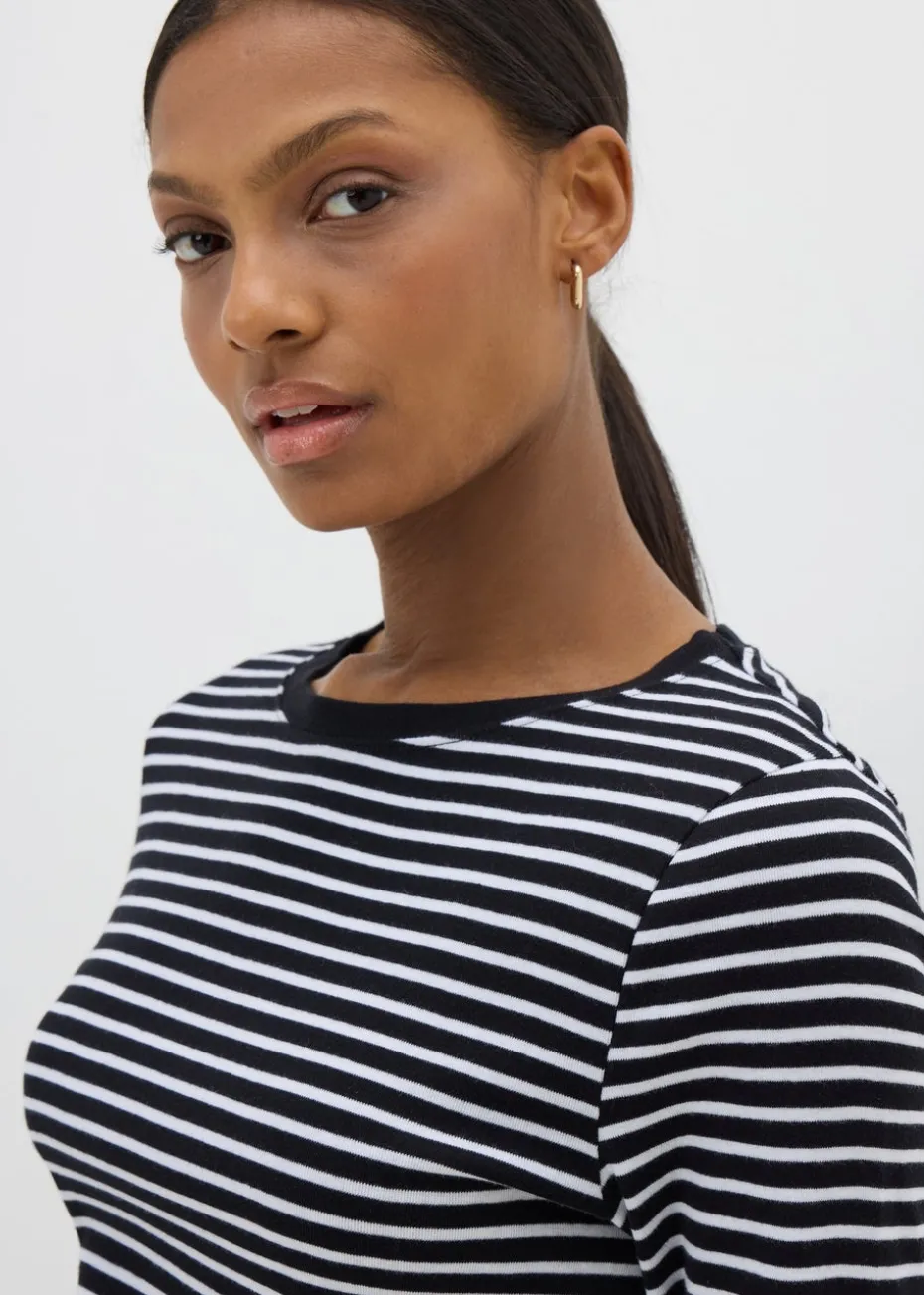 Our Long Sleeve Fitted Stripe Top in black is a must-have staple for your wardrobe. Crafted from soft, 100% cotton, this tee offers a figure-flattering fit that accentuates your curves. The long sleeves provide coverage and warmth, making it perfect for cooler weather. The versatile mono stripe design pairs effortlessly with any outfit, allowing you to dress it up or down for any occasion. Layer under a blazer or jacket for a polished office ensemble.
