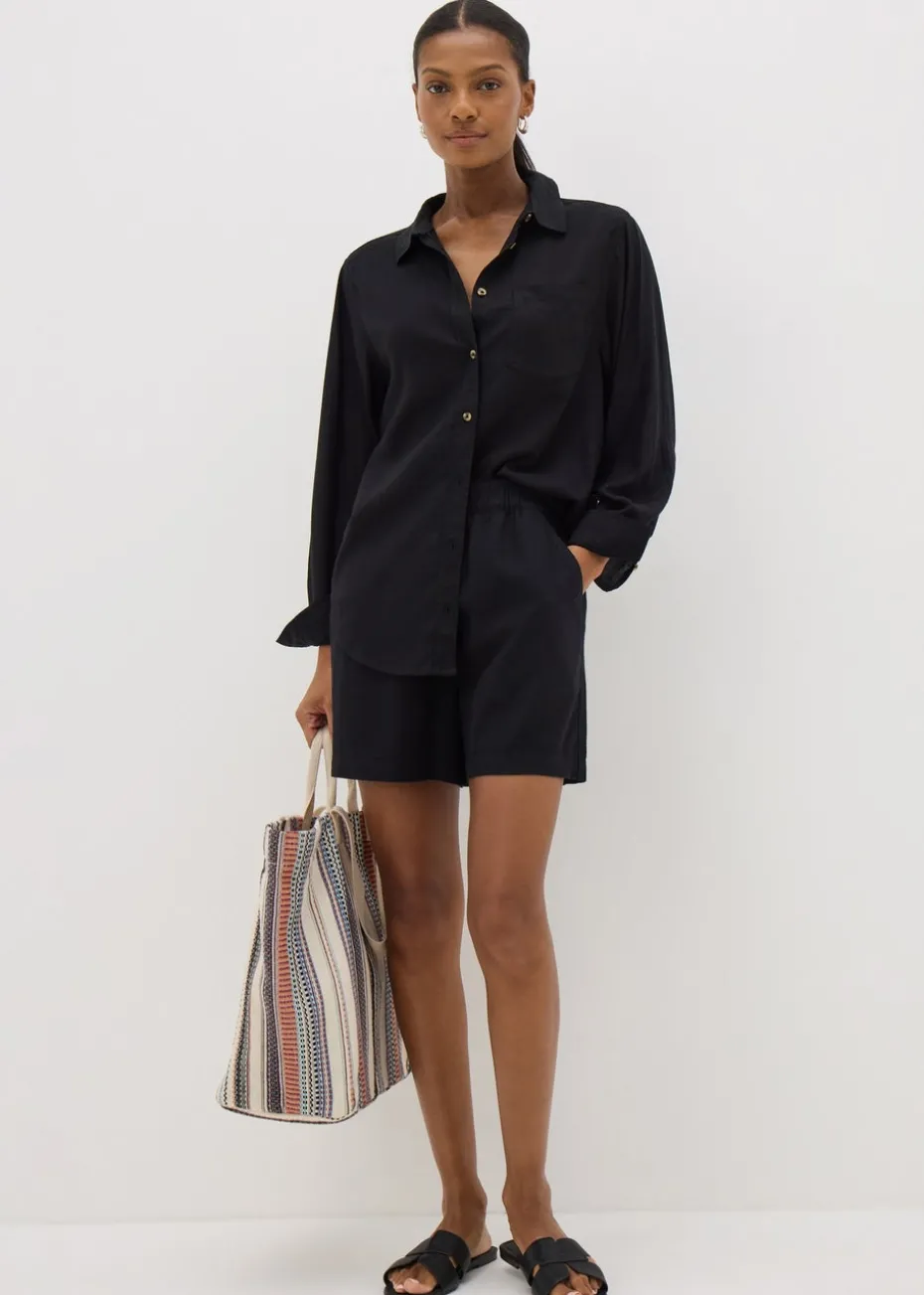 These elegant black linen blend shorts are a must-have for any summer collection. Made from a luxurious linen blend fabric, these shorts are lightweight and airy, ensuring all-day comfort. The solid black colour makes them incredibly versatile, easily paired with a variety of tops and accessories.
