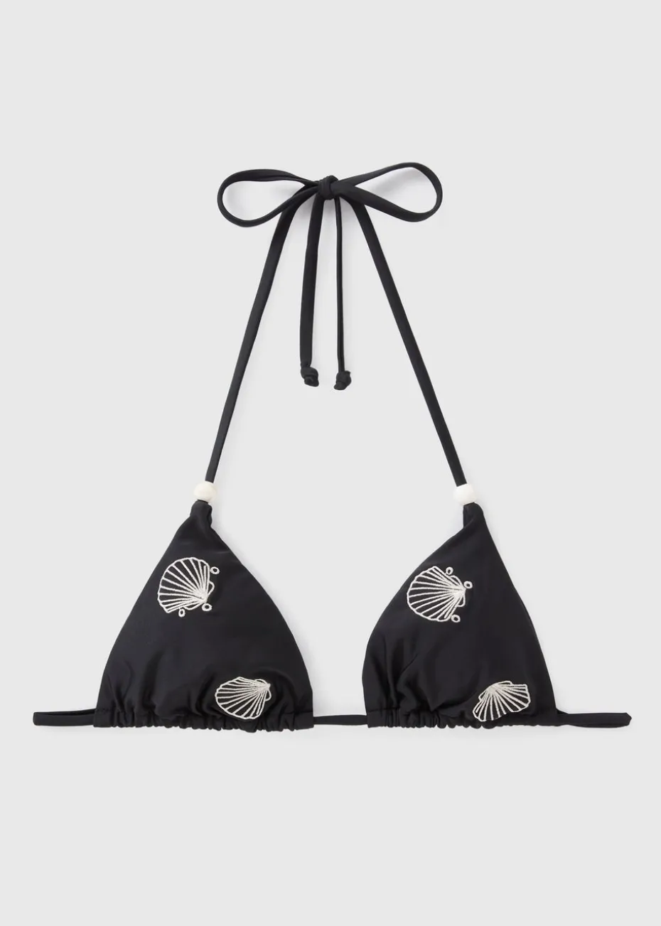 Channel effortless beachside elegance with the Black Shell Embroidered Triangle Bikini Top. Designed in a timeless black hue and finished with delicate shell embroidery, this top blends minimal style with a subtle coastal twist. The classic triangle shape features adjustable halter and back ties, allowing you to customize your fit for comfort and support. Lightly lined cups offer a natural shape, while the embroidery adds a playful, feminine finish. Perfect for pool days, beach holidays, or soaking up the sun, pair it with the matching bikini bottoms for a coordinated summer look.