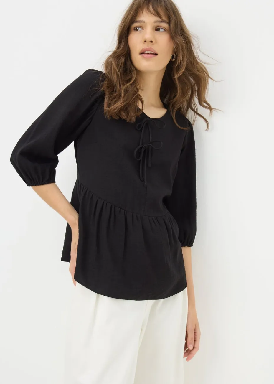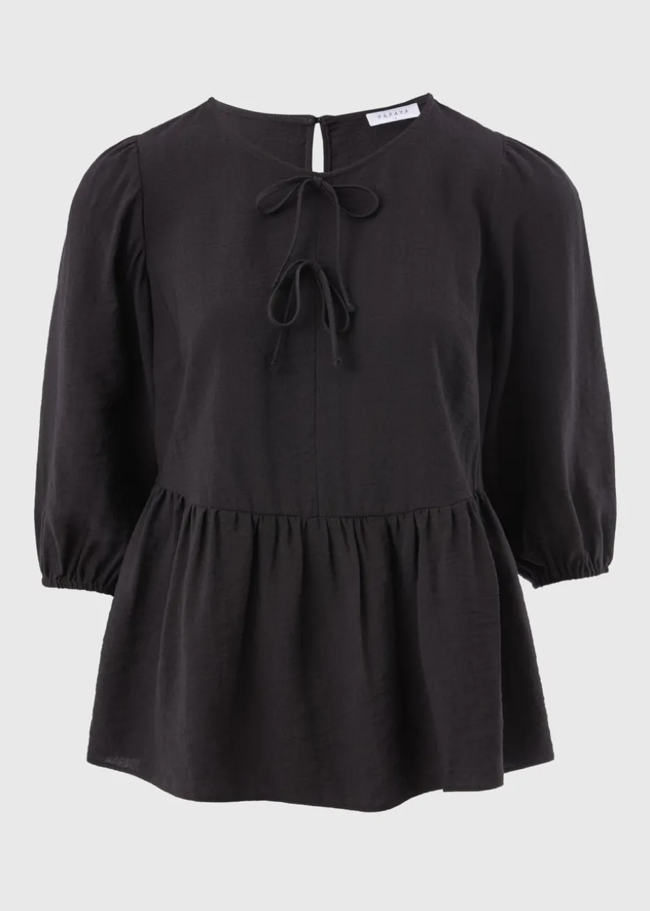The Black Tie Neck Peplum Blouse combines timeless elegance with modern flair. Featuring a feminine tie neck detail and a flattering peplum silhouette, this blouse creates a polished, chic look. Crafted from soft, breathable fabric, it offers comfort and versatility, making it perfect for both professional settings and evening outings.