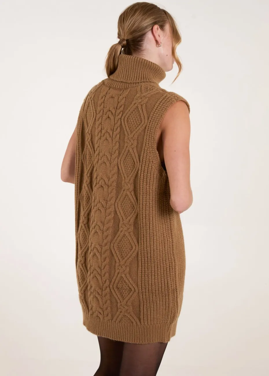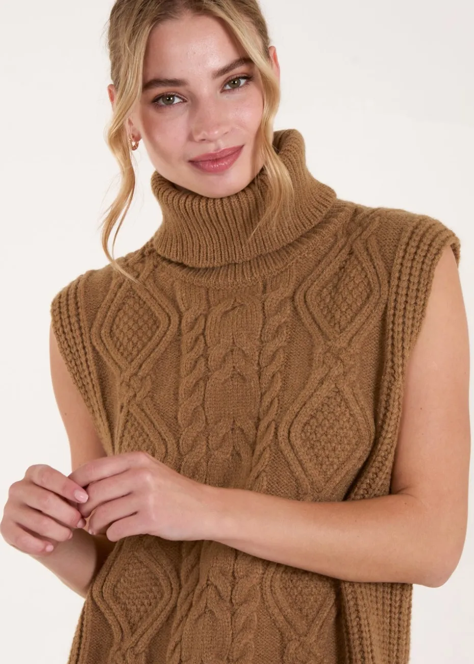 Blue Vanilla Beige Roll Neck Cable Knitted Oversized Sleeveless Jumper