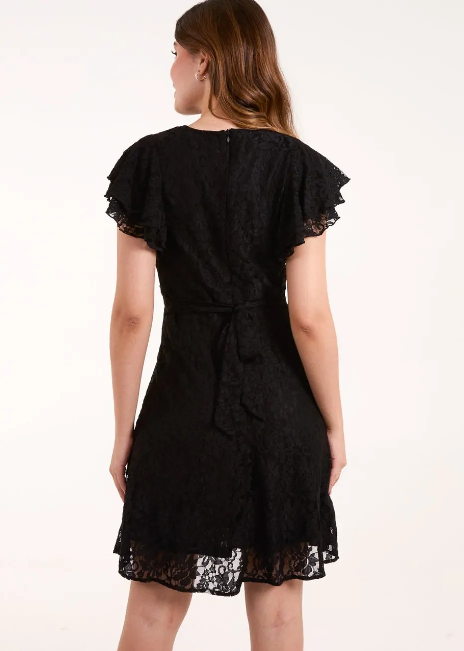 Crafted from a delicate lace fabric make this black mini dress feel extra-special teamed with silver strappy heels and swipe of red lipstick.
