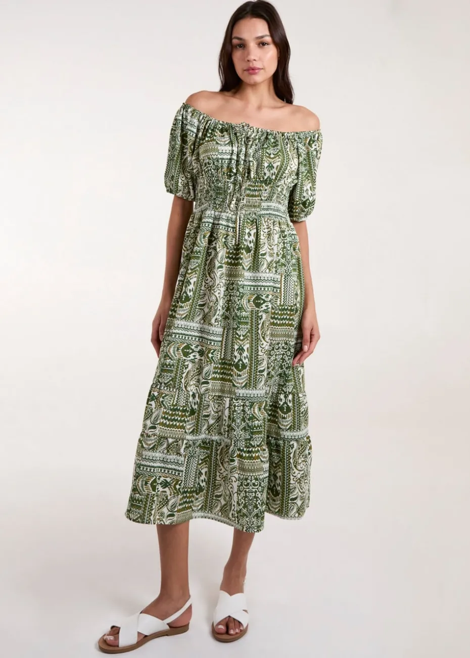 Blue Vanilla Green Scoop Neck Paisley Midi Dress