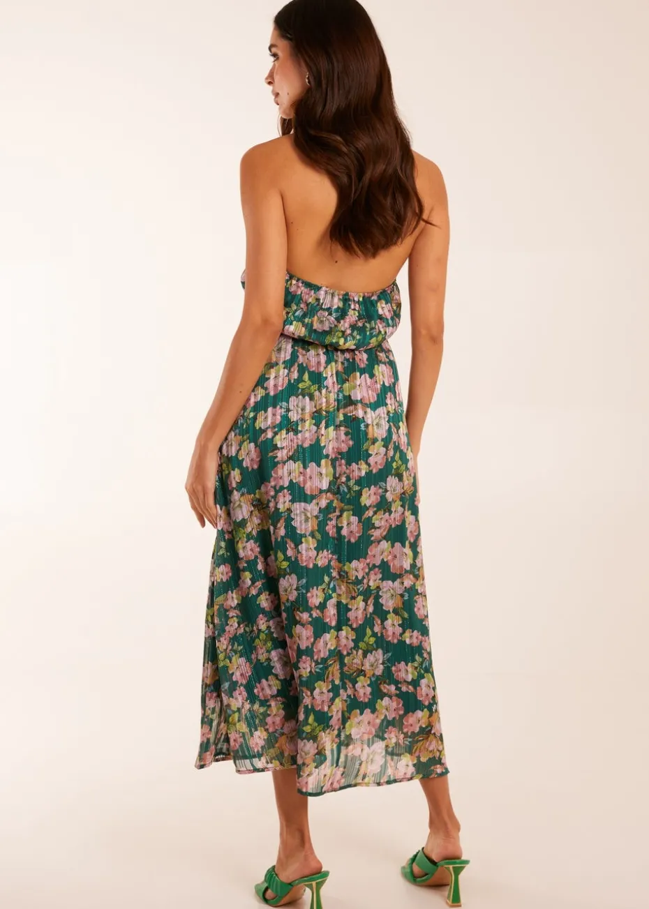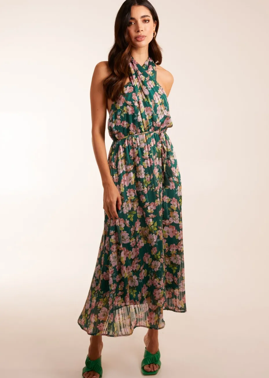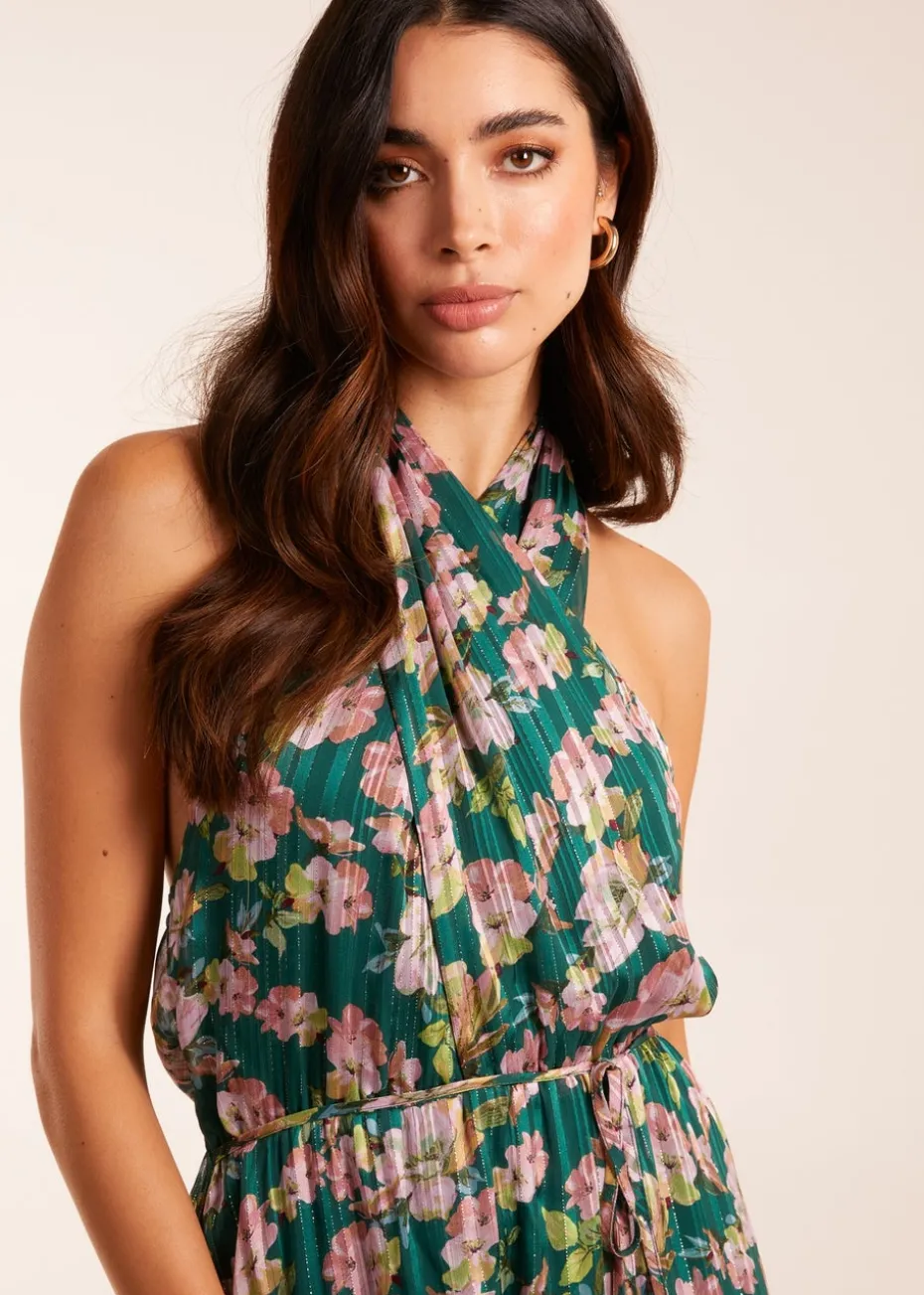 Blue Vanilla Green Wrap Halter Neck Pleated Midi Dress