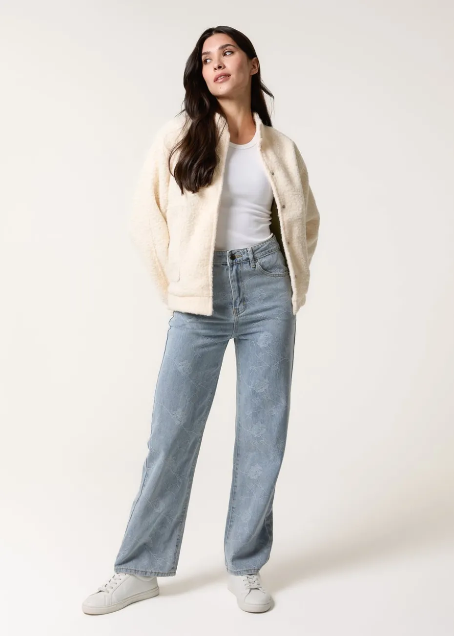 A cute and cosy shearling bomber jacket. The ultimate layering piece as we move into Spring/ Summer. Providing nothing but warmth and style.