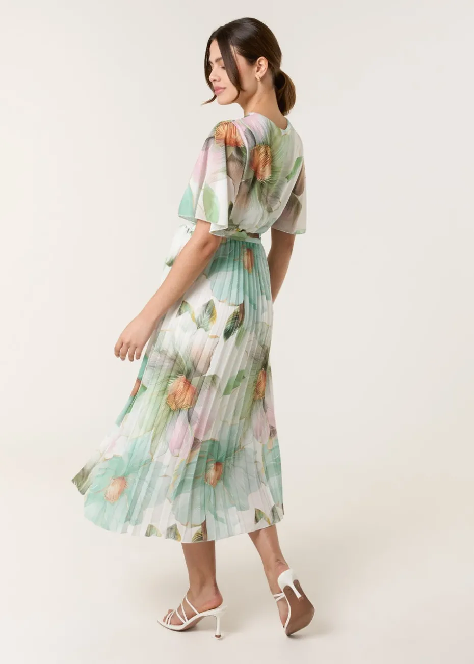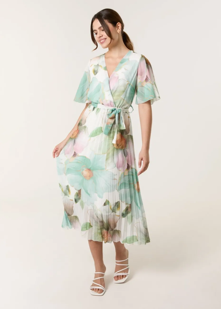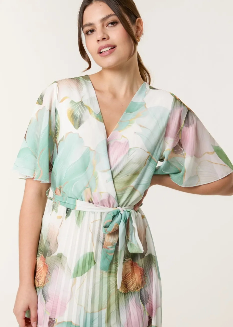 Blue Vanilla Sage Watercolour Floral Printed Wrap Front Pleated Dress