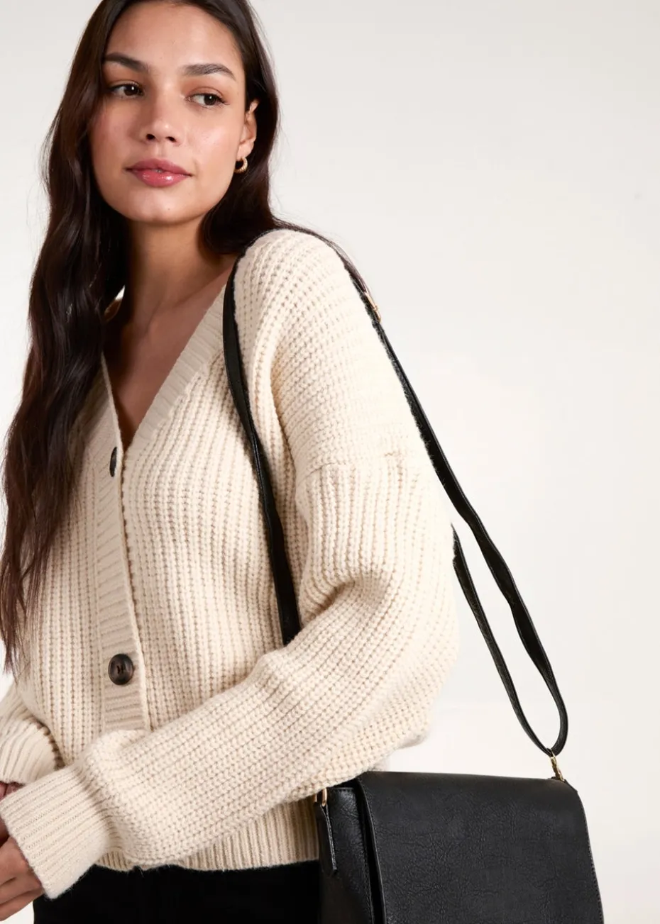 A layering essential! This cropped, chunky cardi can be perfectly paired with jeans, and leather look boots.