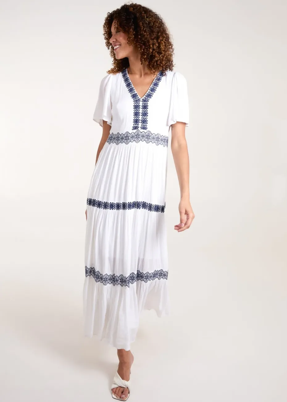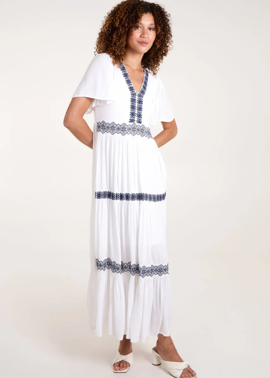 Blue Vanilla White Embroidered Tiered Maxi Dress