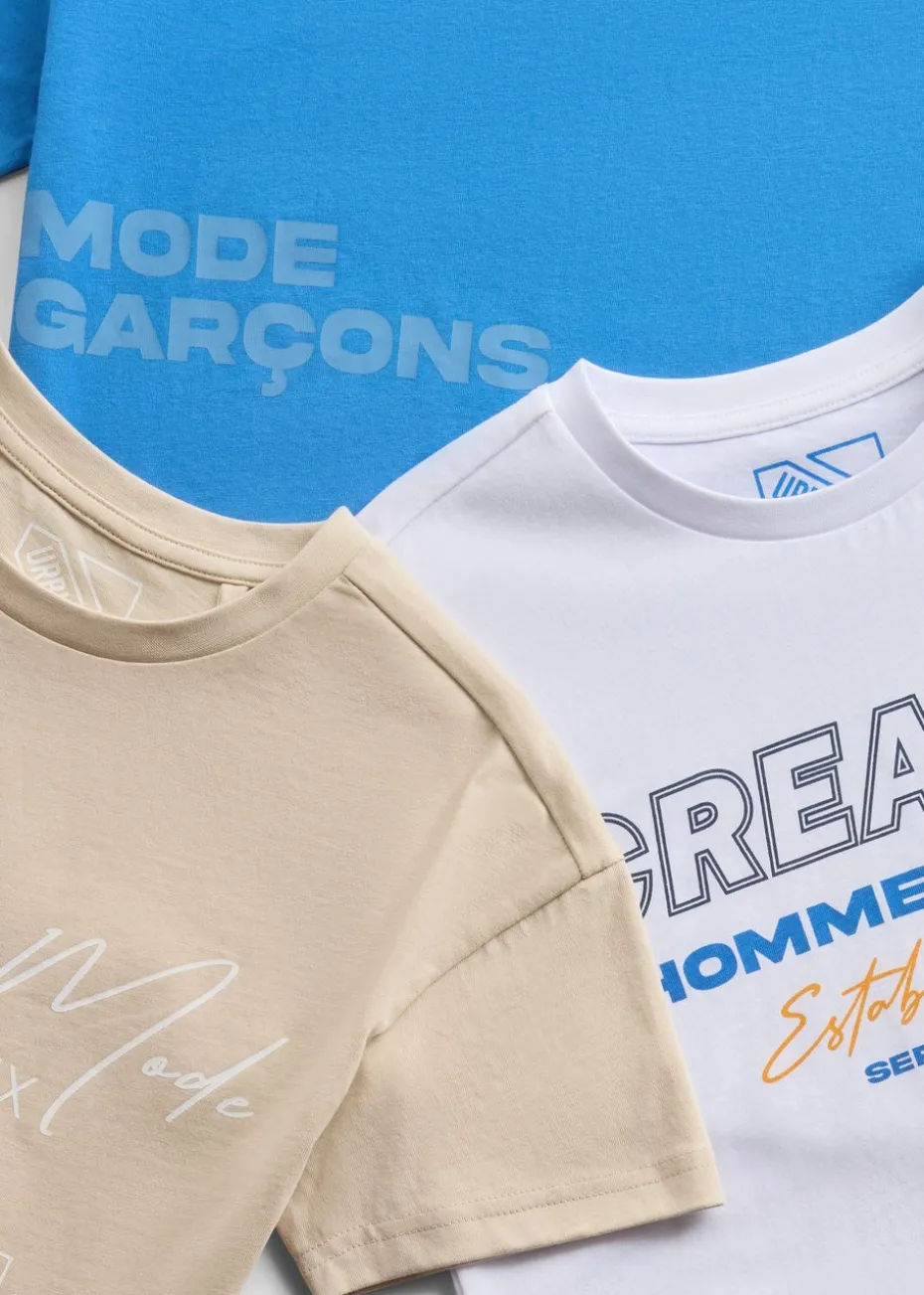 - 1 x blue t-shirt with ‘Mode Garcons’ slogan print