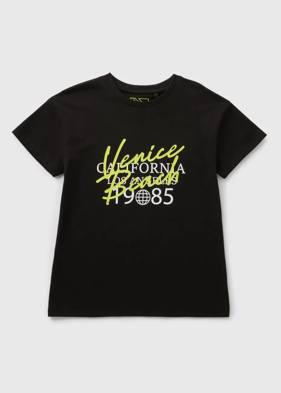 Made for days at the beach or in the park, this black tee from our boys department features a colourful ‘Cali Beach’ design to the front. Crafted from a soft polycotton blend, it has short sleeves and a classic crew neckline for all-day comfort. Perfect for everyday wear, pair with shorts or joggers and sandals for a laid-back look.