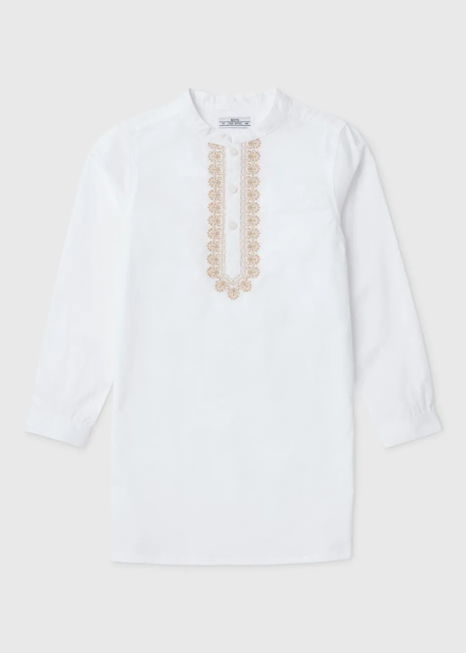 Celebrate Eid in style with our Boys White Eid Kurta Shirt, specially designed for children aged 7-13 years. This shirt is made from a soft, breathable fabric that keeps your child comfortable throughout the festive occasion. The golden embroidery adds a touch of tradition. The shirt features a classic collar, long sleeves, and a regular fit that fits all. Whether you’re attending a family gathering, a mosque service, or a party, this shirt will make your child look and feel great. Pair it with trousers, jeans, or a thobe for a complete look.