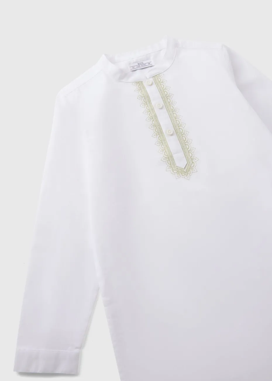 A timeless classic, our kurta shirt in crisp white is a must-have for any young lad’s wardrobe. Crafted from a soft cotton-blend fabric, this kurta shirt ensures utmost comfort all day long. Featuring intricate pintucks and delicate embroidery on the chest, this kurta shirt exudes an air of sophistication. The full sleeves and mandarin collar add to its charm.