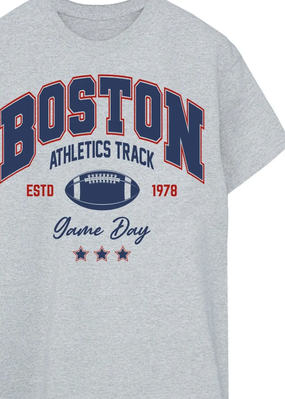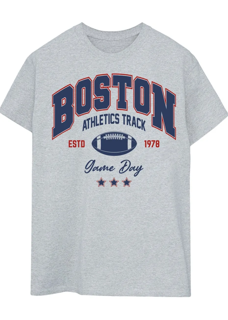 Add a sporty touch to your casual wardrobe with this men’s Boston Athletics T-shirt. Featuring a bold collegiate-style “Boston Athletics Track” graphic with a classic American football design, this grey marl tee is perfect for game day or everyday wear. Made from soft and breathable cotton, it offers all-day comfort with a relaxed fit. Whether you’re a sports fan or just love vintage-inspired styles, this T-shirt pairs effortlessly with jeans or joggers for an easy, laid-back look.