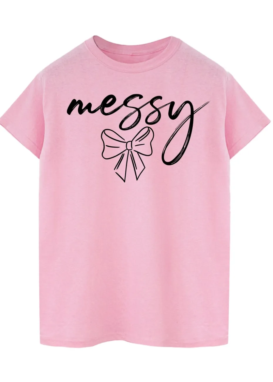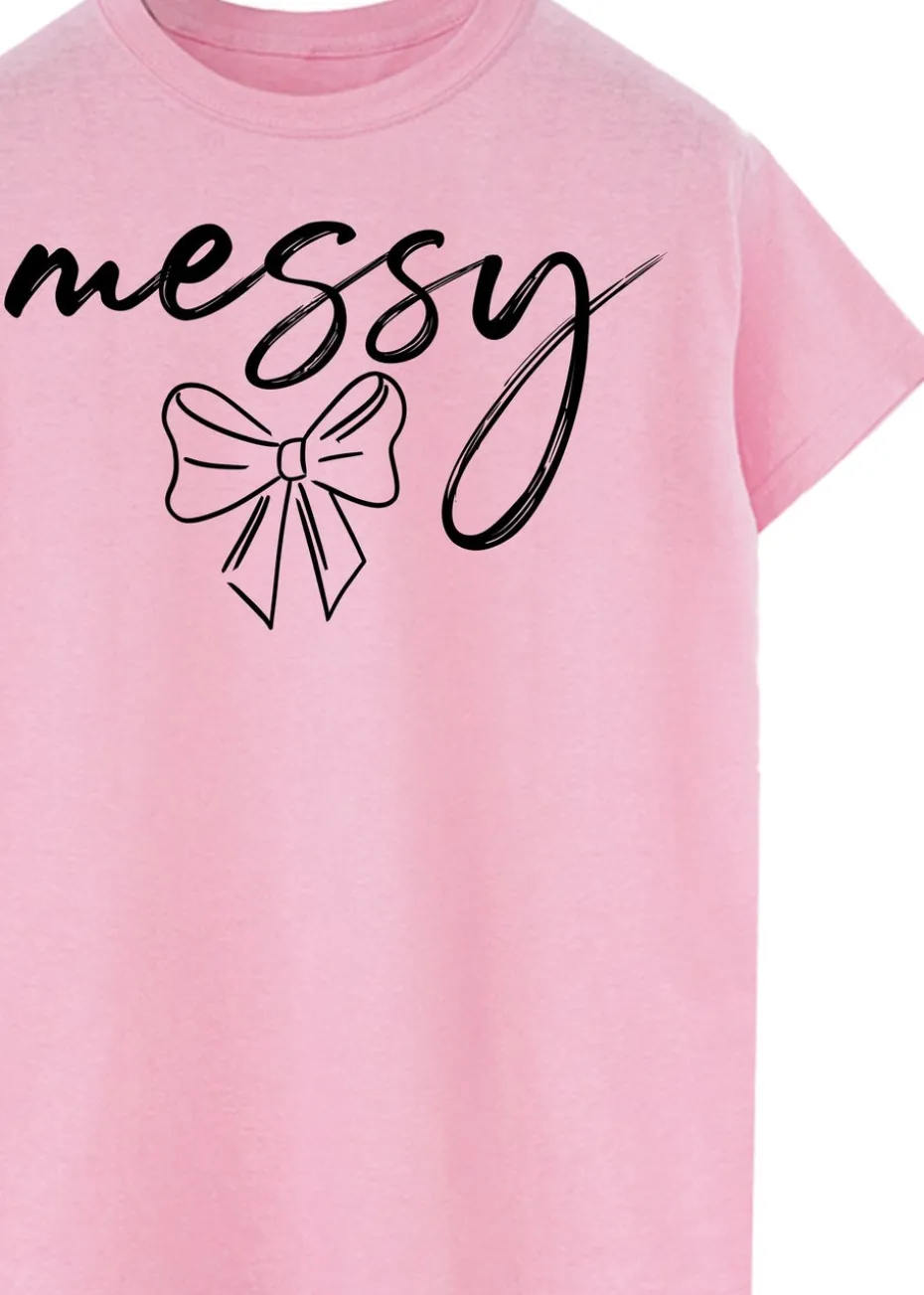 Keep it cute and casual with this pastel pink T-shirt. Featuring a stylish handwritten “messy” slogan with a delicate bow graphic, this tee adds a playful and feminine touch to your everyday wardrobe. Made from soft cotton for comfort, it’s designed in a relaxed fit that’s perfect for pairing with jeans or leggings for an effortlessly stylish look.
