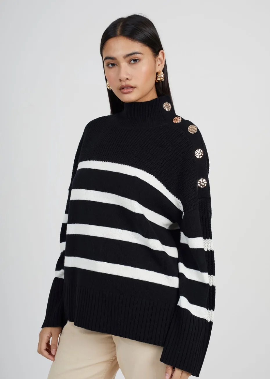 Brave Soul Black Button Detail Striped Turtleneck Jumper