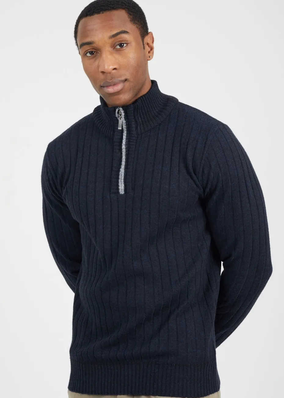 Be the first to review “Brave Soul Navy Quarter Zip Funnel Neck Rib Knit Jumper” Cancel reply