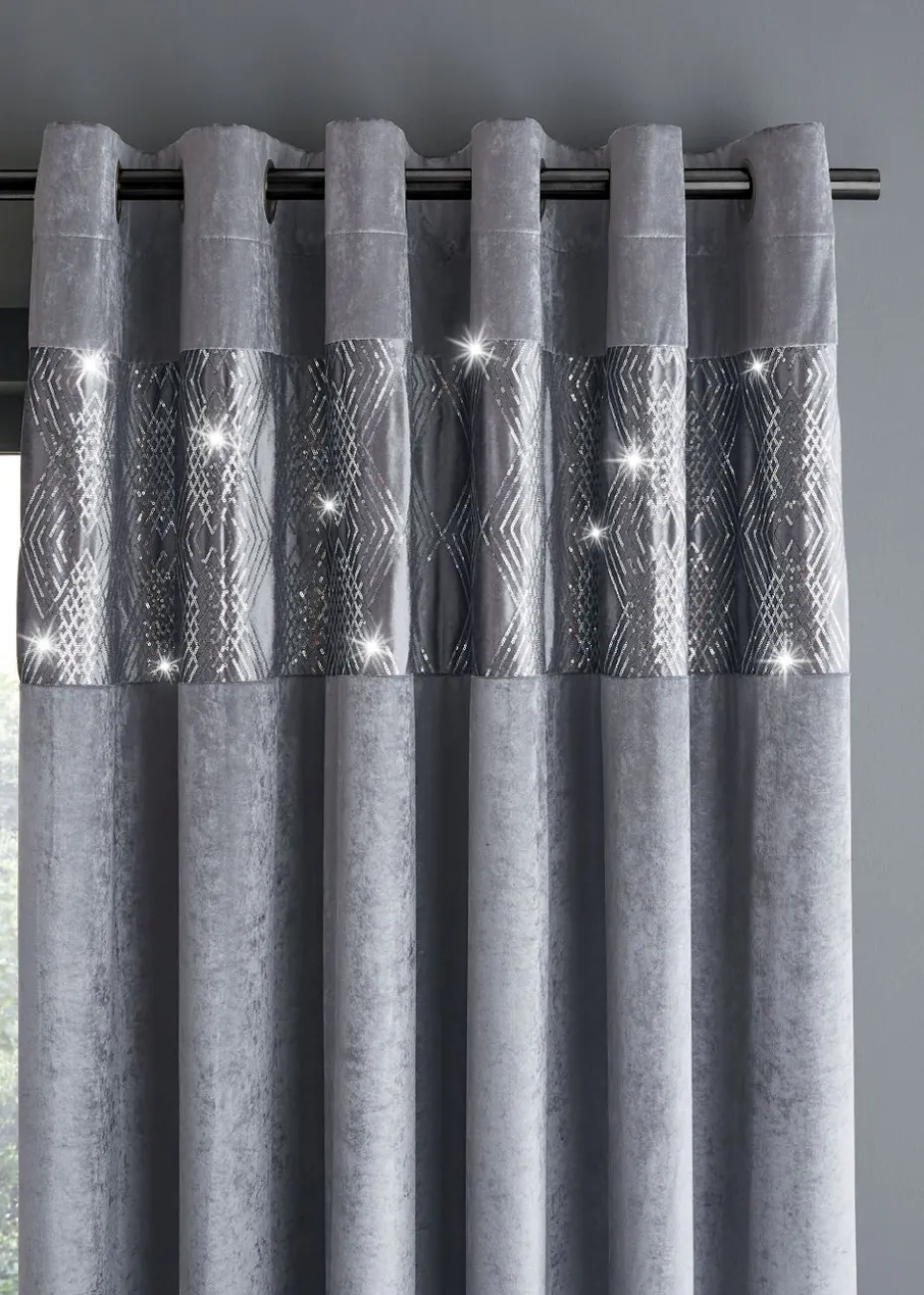 Elevate the elegance of any room; with these glamourous Art Deco inspired luxurious curtains. This design has a super-stylish crushed velvet header, a shimmering geometric sequin panel, and comes complete with a tonal lining; to create a sleek finish. Catherine Lansfield is renowned for style and quality – designed and developed in Great Britain. Ethically sourced overseas and made to quality and human-ecological safety standards.