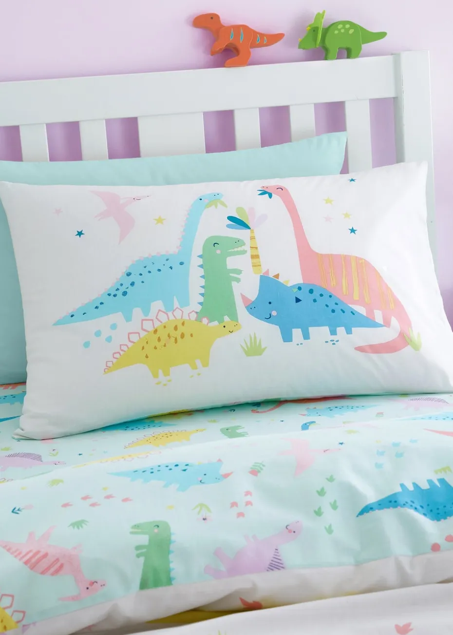 Let their imagination roam with this cute fully reversible bedding set, perfect for little ones who adore friendly dinosaurs. In pretty pastel shades and a complementary blue tone reverse, this set will give their room an a-roar-able makeover. Created from easy-care recycled polyester and soft responsibly sourced cotton, blended together for everyday use. Catherine Lansfield is renowned for style and quality – designed and developed in Great Britain. Made to quality and human-ecological safety standards, in accordance with STANDARD 100 by OEKO-TEX®.