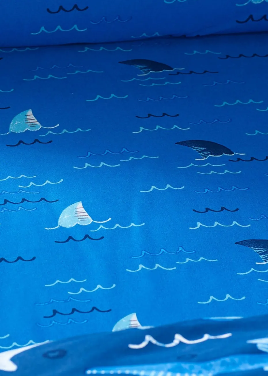 Dive into a sea of adventure with this totally Jawsome bedding set, featuring playful sharks swimming across a deep blue background. This vibrant design is perfect for little ocean explorers, sparking imagination and fun. Created from easy-care recycled polyester and soft cotton, blended for everyday use.